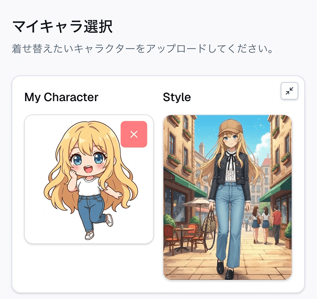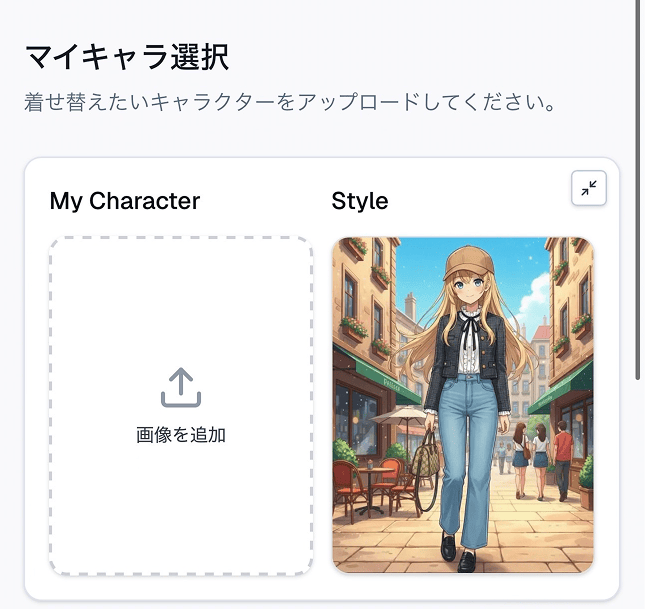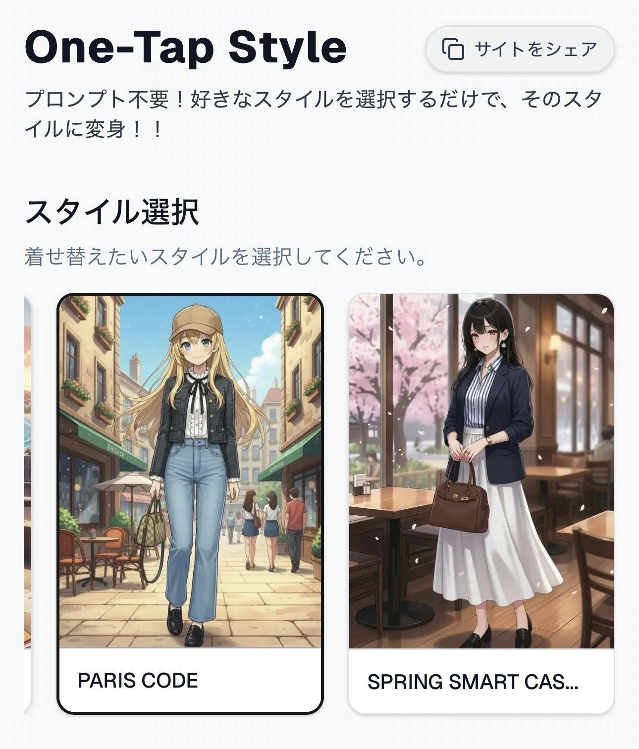 ワンタップスタイルは、プロンプトの入力不要で、キャラクターを手軽に着せ替え画像を作れる機能です。