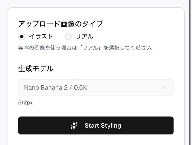 スタイルとキャラクターを選んだら、あとは「Start Styling」を押すだけです。難しい設定は必要なく、すぐに生成を始められるのがワンタップスタイルの良いところです!