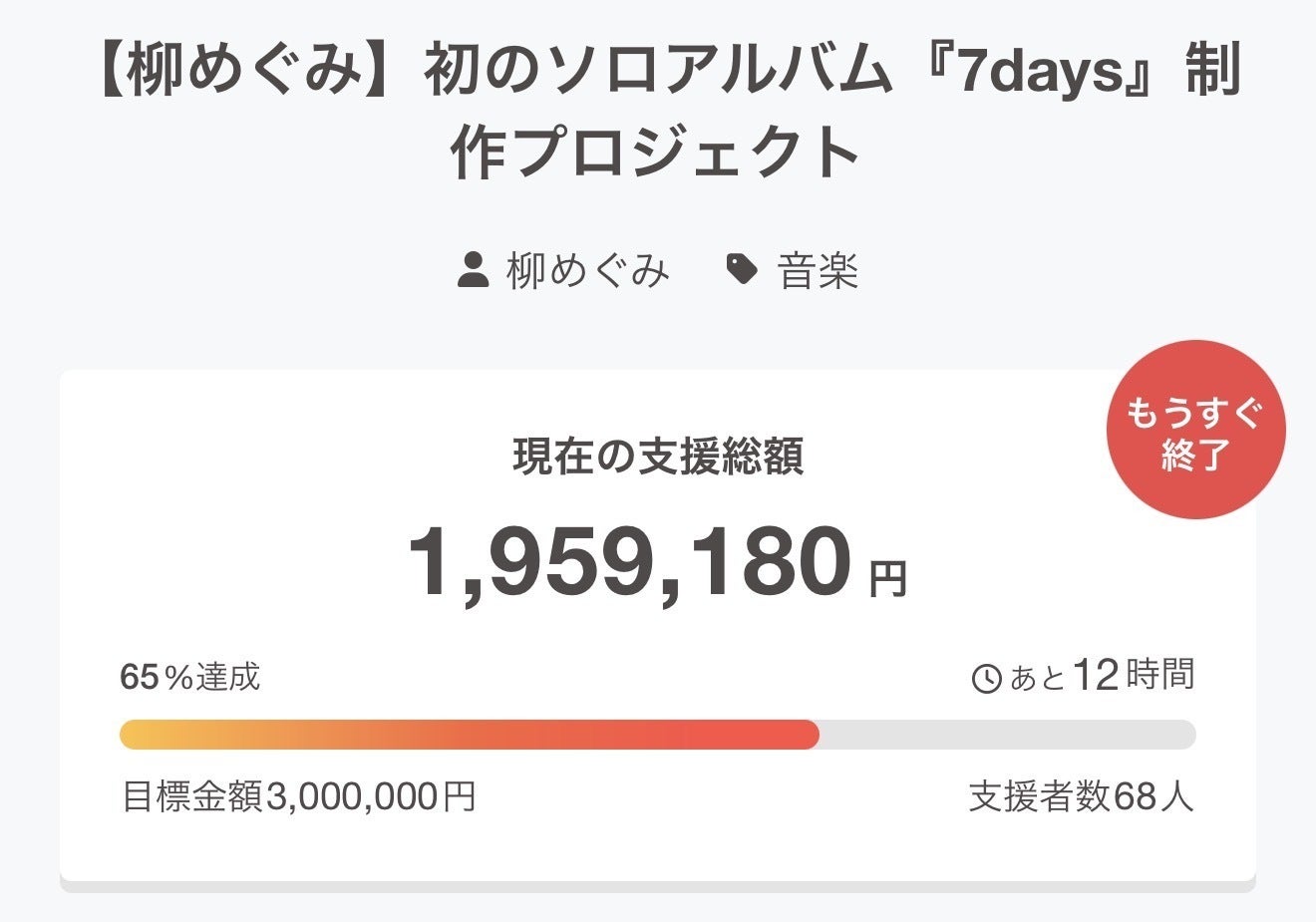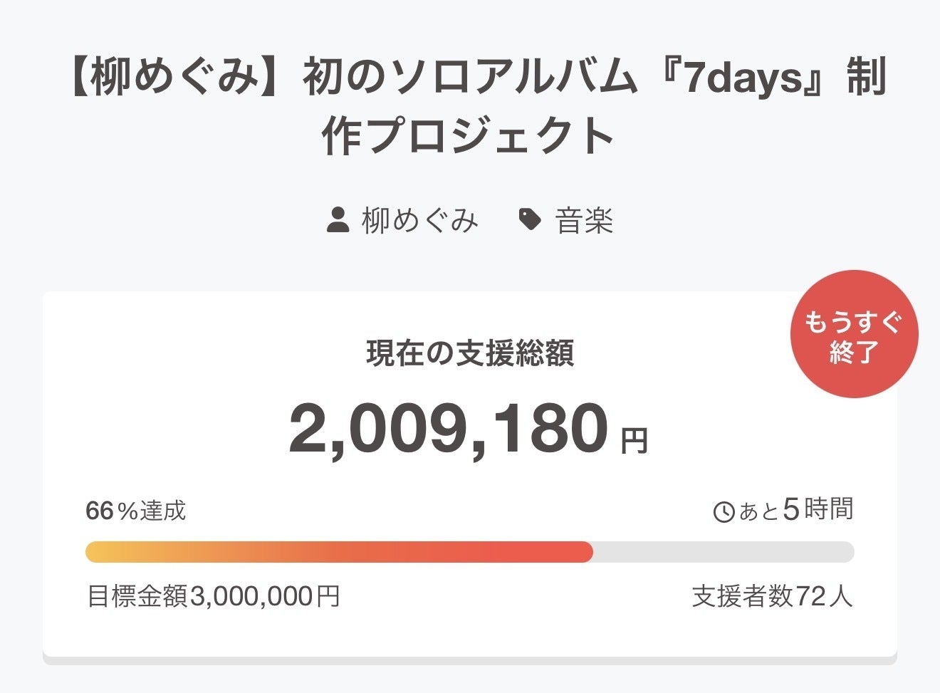 2026/03/31 18:15ついに終了まで5時間を切りました。72名の皆様、本当にありがとうございます。そして200万円に乗せて頂きありがとうございます!!!皆さんのラストスパートにゴールまでの希望が見えてきました。今一度。5000円のリターンから全て限定のアルバムがつきます。今心を込めて制作している曲たち。皆さんの手に渡るのは少し先になりますが、待っていて下さい。皆さんのかけがえのない【7days】に寄り添える、強くて優しくて、暖かいアルバムをお届けします。今日はTikTokで皆さんとラストを見守る配信をします。21時から0時までは必ず配信がついているので、是非遊びに来て下さい!そしてーーー、、、!!!まだ支援を迷っているお気に入り登録者の皆様!!一緒にもう一段このプロジェクトを押し上げて下さい。どうぞよろしくお願いいたします!! もっと見る