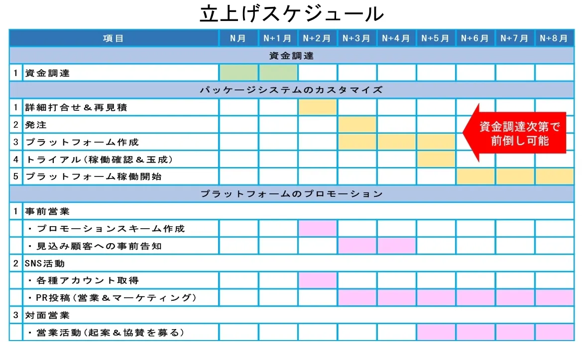 準備としては、資金調達を優先し、調達成功でプラットフォーム構築に着手します。それと並行してプラットフォーム周知のSNS活用や営業活動を平行して行います。またクラファン運営のために必要な利用規約(作成済)、運営マニュアル、ユーザーガイド等の作成も行います。