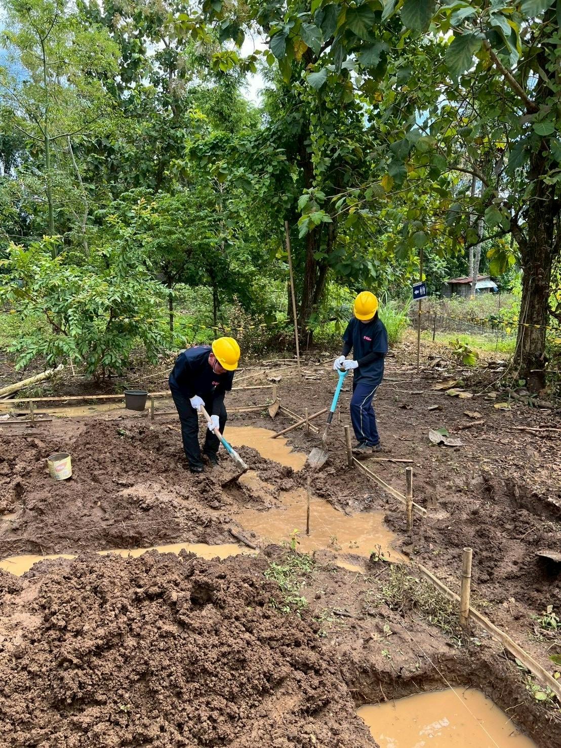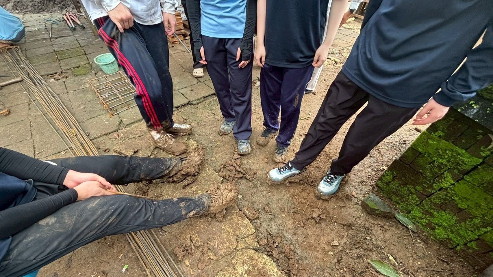照りつける太陽の下、慣れない手つきでの作業は想像以上に体力を消耗しました。写真にある通り、足場の悪い中での作業で、初日にして靴や服が泥だらけになるメンバーもいましたが、みんな一心不乱に体を動かしました!