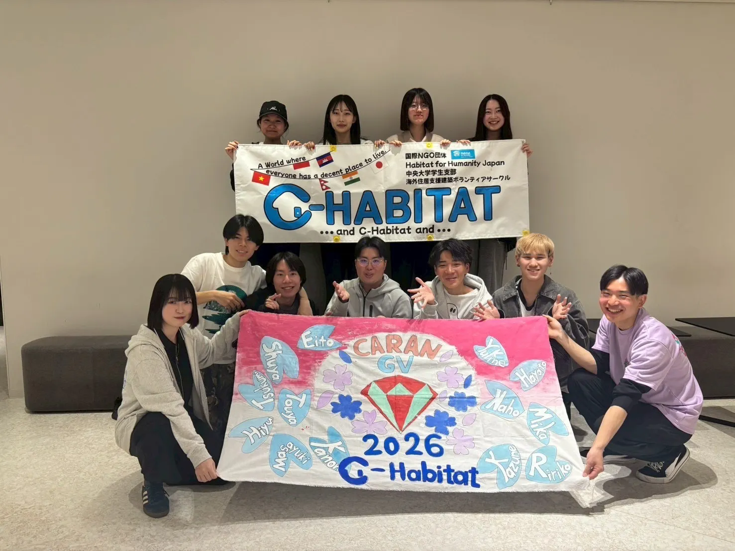 本日、私たちはインドネシアへの出発を前に大学のキャンパスに集まり、ミーティングを行いました。ミーティングでは、メンバー1人ひとりがこの12日間で「何を得たいか」「どう過ごしたいか」という個人目標を発表し合いました。それぞれの胸に秘めた熱い想いや覚悟を共有することで、チーム全体が良い刺激に包まれ、出発に向けてさらに一体感が高まったと感じています。また、このプロジェクトにおけるチーム全体の目標が「We CARE. We CAN.」に決定しました。We CARE:誰もひとりにせず、全員が全員を思いやれるチームであること。特定の関係性に留まらず、メンバー全員が深く繋がり、支え合いたいという願いを込めています。We CAN:一人ひとりが現地での経験を通じて、「できること」を一つでも多く増やしていくこと。この二つの言葉を合わせると、私たちのチーム名である「CARAN(カラン)」になります。このスローガンを胸に、私たちは現地での困難も全員で乗り越えていく覚悟です。 茗荷谷キャンパスで多くの温かいお見送りをしていただいたあと、高ぶる気持ちを胸にみんなでスーツケースを引きながら、羽田空港へ向かいました!第2ターミナルでうどんを食べる人と、先に国際線の出発口である、第3ターミナルへ先に行き、牛丼を食べる人に分かれ、それぞれ日本での最後の晩餐を楽しみました。その後は、スーツケースの重さが規定の重さを超えているかを感覚で確かめあったりしました。移動では重いスーツケースを「大丈夫?持つよ!」などと気遣う一面も見られ、メンバーの優しさに触れることができました。さらに移動中は、みんなが交互に入れ替わるため、今まであまり関われていなかったメンバーとも話すことができ、チームの仲が深まったように思います。できないことや、不足している部分は補いあったりするなど、メンバー間での協力により無事に13人全員でシンガポールに着くことができました! 初めての海外渡航で多くの不安を抱えて今日を迎えたメンバーもいました。しかし、茗荷谷キャンパスで暖かいお見送りや激励の言葉をいただいたり、メンバーの優しさに触れることができたりしたお陰で、安心して日本を発つことができました。ありがとう!また改めて、今回お見送りをしてくれたC-Habitatメンバーのみんな、本当にありがとうございました!! これから現地での活動の様子などを、このクラウドファンディングのサイトを通じて、共有させていただきたいと考えています。是非楽しみにしていてくれると、嬉しいです!