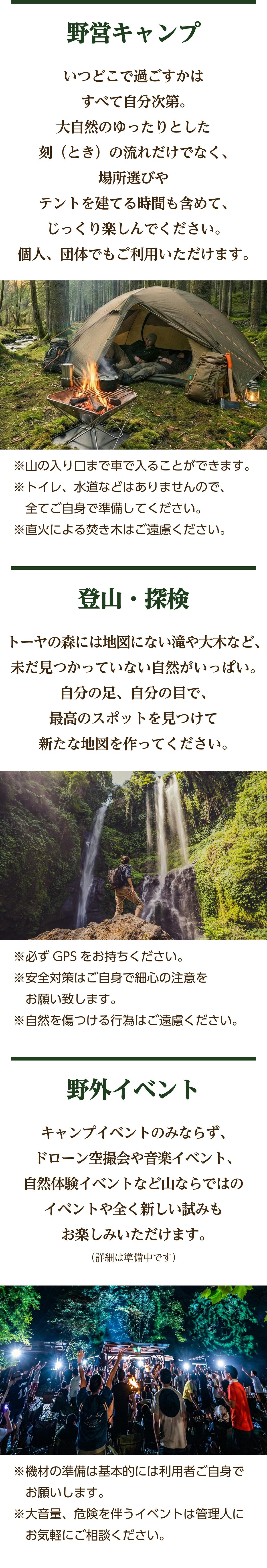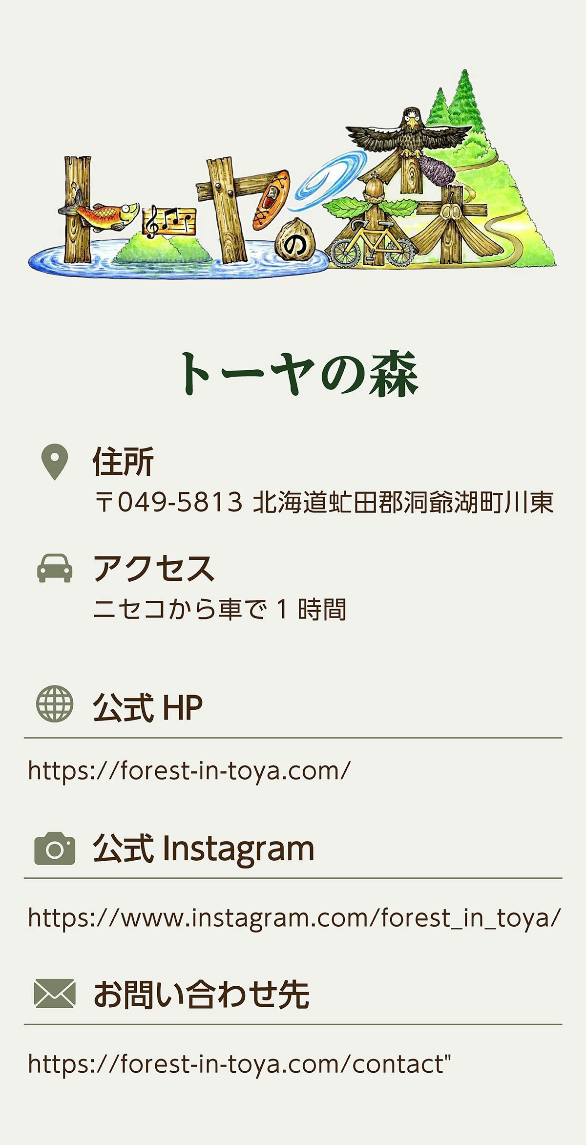 洞爺湖という雄大な自然を目の前に感じながら、そこに広がる森をフィールドに、ひたすらに遊ぶ人、流れる時間を楽しむ人、自己表現を目指す人、多様な人が、お互いを認め合いながら、日常と違う時間軸を過ごせる場所。