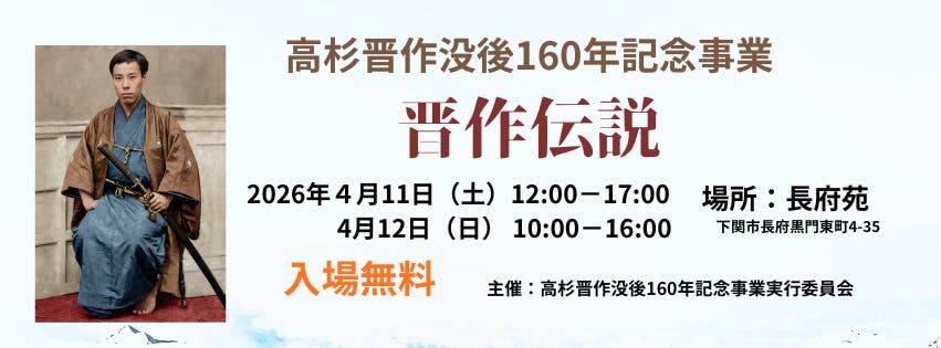 2026年4月11−12日に、高杉晋作没後160年記念事業を下関市長府の長府苑で開催します。高杉晋作没後160年記念事業実行委員会の亀田真砂子と申します。