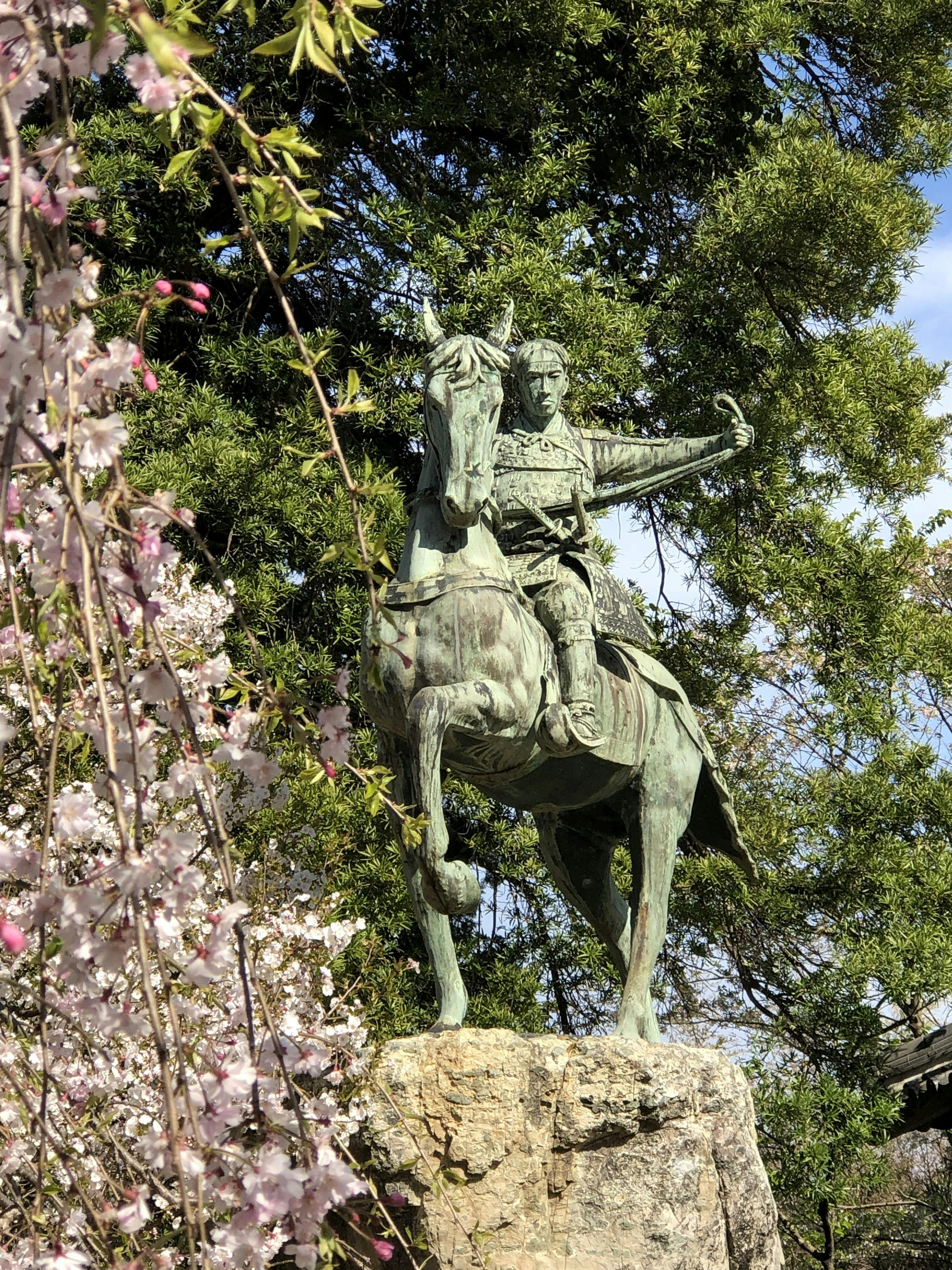 長府の功山寺には、晋作の騎馬像があります。4月に入っても枝垂れ桜が残り、とても気持ちのいい境内で素敵な写真が撮れますよ。