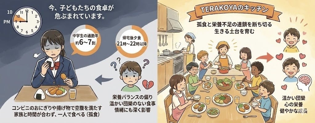 その結果、何が起きているか。「コンビニのおにぎりや揚げ物で空腹を満たす」 「家族と時間が合わず、一人で食べる(孤食)」。栄養バランスの偏りだけでなく、温かい団欒のない食事は、子どもたちの情緒にも深く影響します。