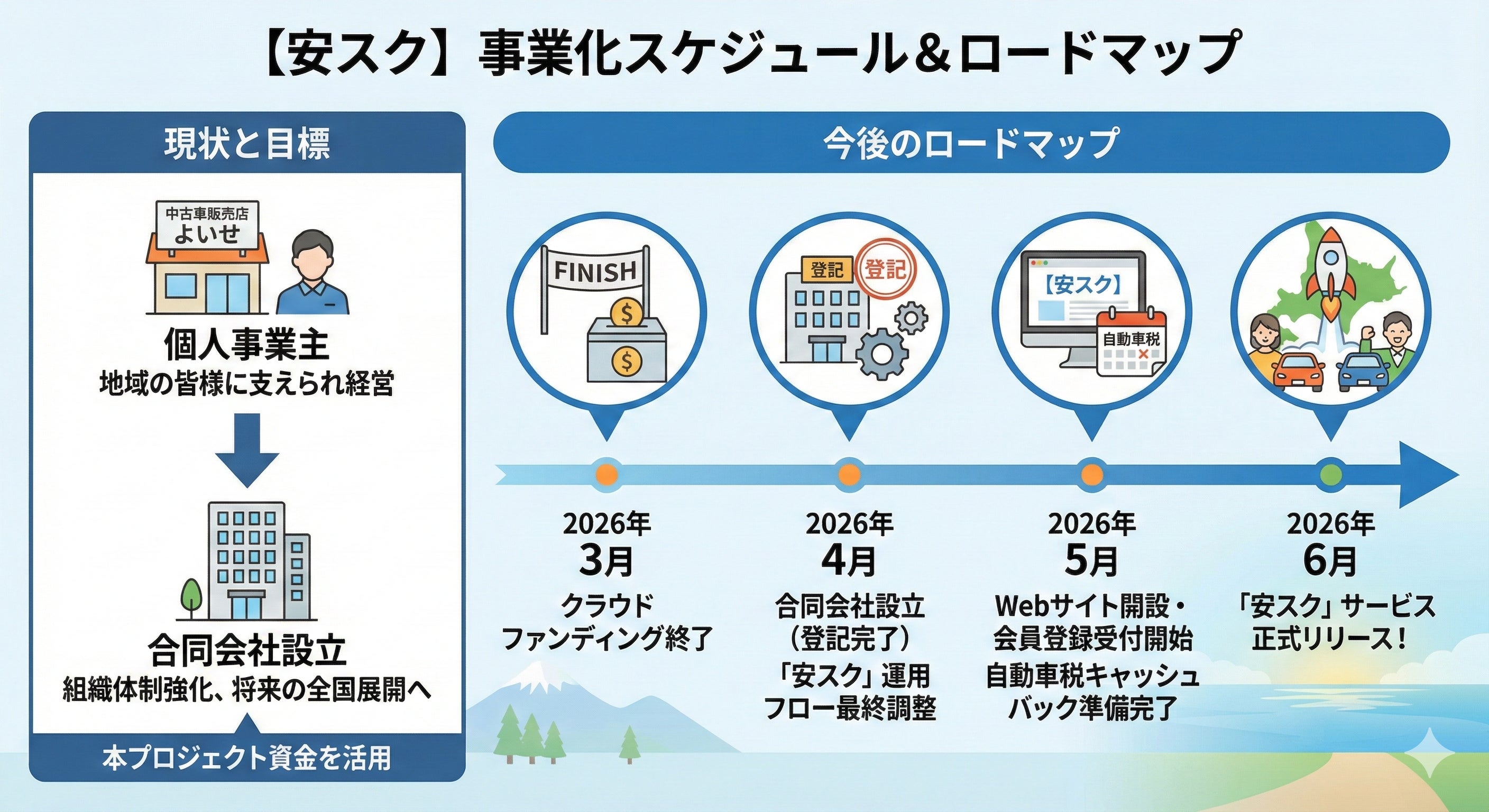 法人化による信用と、皆様からのご支援をエンジンに、私たちは【安スク】を全国へ広げ、日本のカーライフの常識を変えていきます。 「5月の税金も、車検の不安も、もう過去のものにしたい」 その想いに共感してくださるなら、どうか力を貸してください。私たちと一緒に、新しい当たり前を作りましょう。 熱いご支援を、心よりお願い申し上げます!