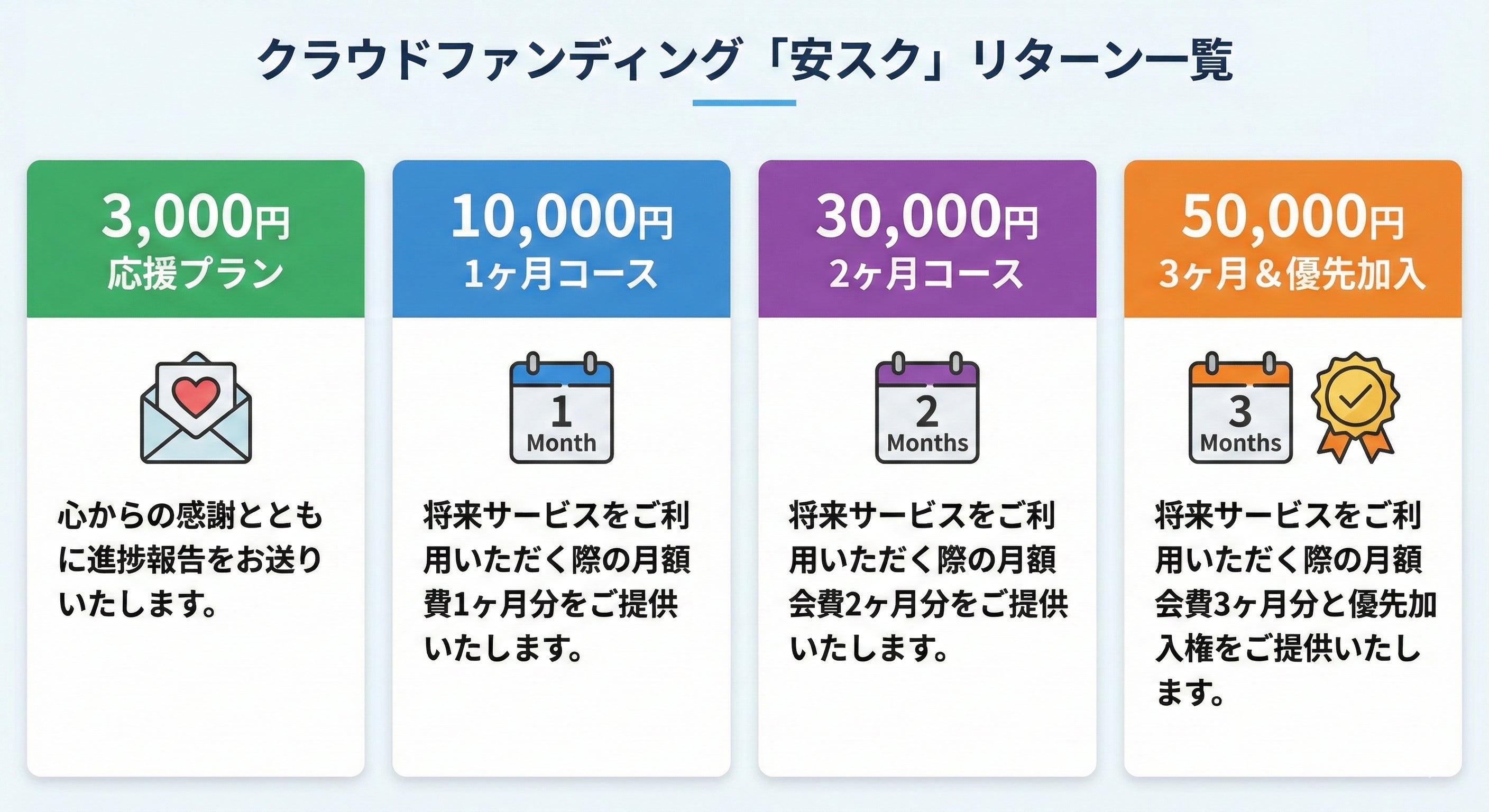 おかげさまで地域の皆様に支えられてきましたが、今回の【安スク】という継続的なサービスを責任を持って運営し、将来的には全国のお客様へお届けするため、本プロジェクトの資金を元手に「合同会社」を設立し、組織体制を強化いたします。