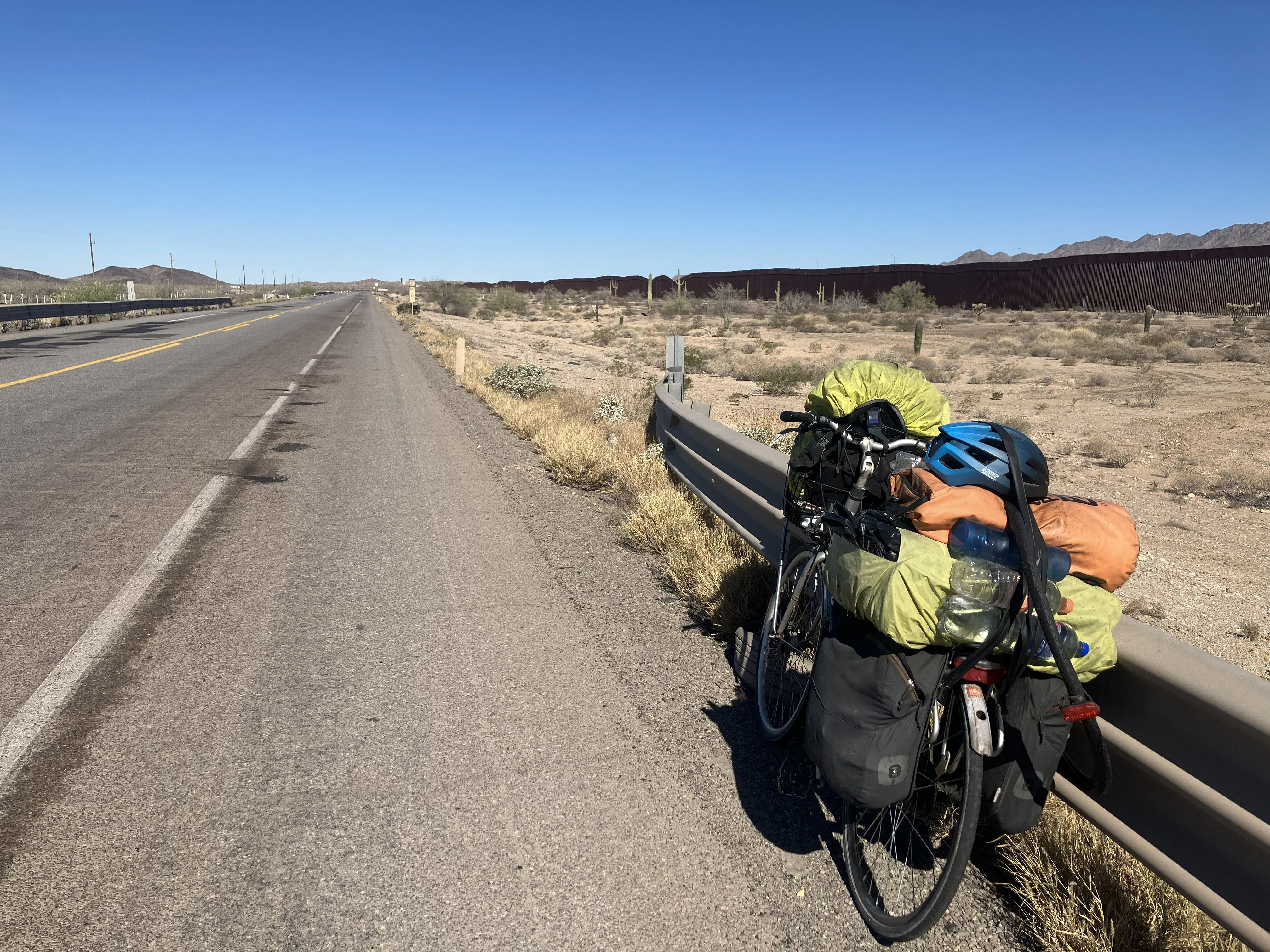 本人はメキシコの北部をアメリカを目指して自転車で走行中です。2026年3月27日の時点でアメリカに接する、ソノラ州を太平洋側に向かっているところです。実際にはアメリカの国境目前を国境に沿った形で進んでいます。写真の右に見える黒い壁がアメリカとメキシコの国境です。
