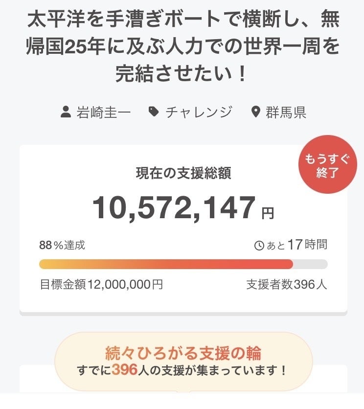 そしていよいよ【太平洋横断手漕ぎ横断】クラウドファンディングも残すところ17時間となっています。