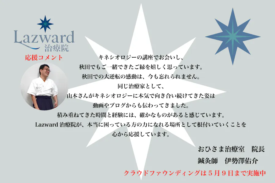 伊勢澤佑介さん(おひさま治療室院長、鍼灸師)から応援コメント頂きました!