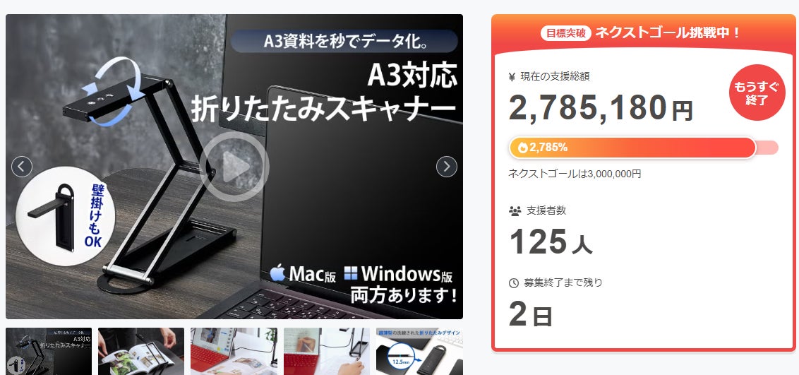 プロジェクト終了後、「【会議資料を秒でデータ化!】A3対応折りたたみスキャナー」をCamfire特別価格で入手することはできなくなりますので、ご支援がまだの方、追加支援 をご検討の方はお急ぎくださいますようお願い申し上げます。