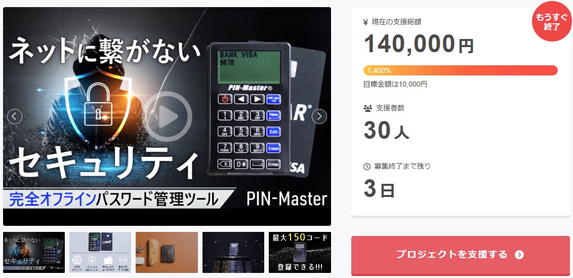 プロジェクト終了後、「完全オフラインでアナログと同等のセキュリティ!超薄型パスワード管理ツール」をCamfire特別価格で入手することはできなくなりますので、ご支援がまだの方、追加支援 をご検討の方はお急ぎくださいますようお願い申し上げます。