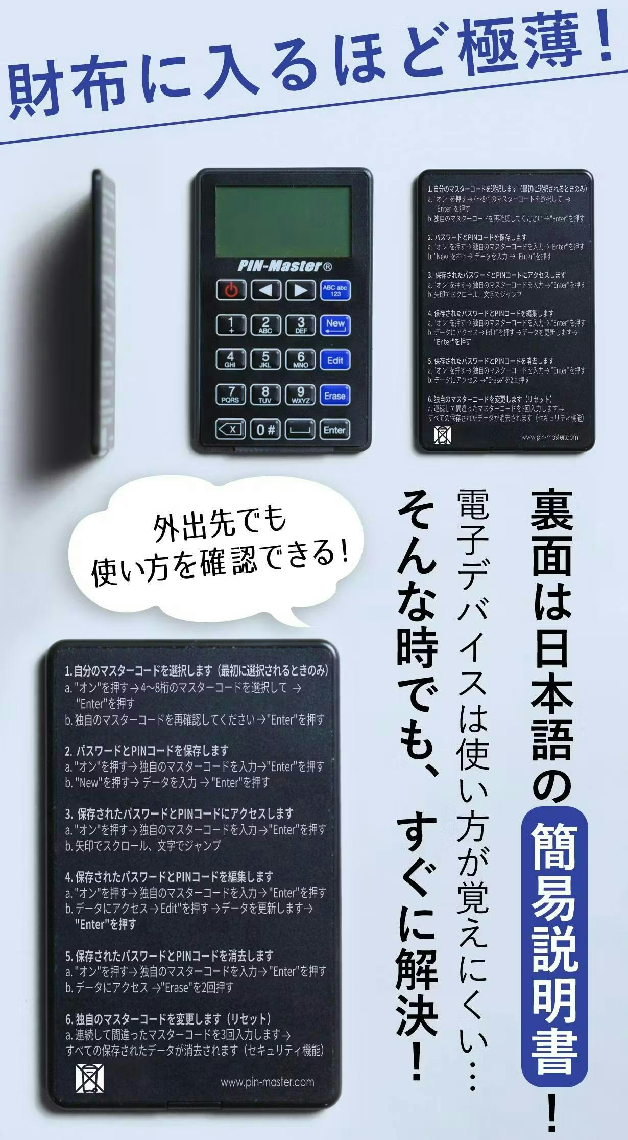 PIN-Masterは86×54×4mmのカードサイズに機能と簡易説明書をどっちも両立!外出先や作業中など、ふとした瞬間に使い方を忘れてしまっても、本体ひとつですぐに確認できます!