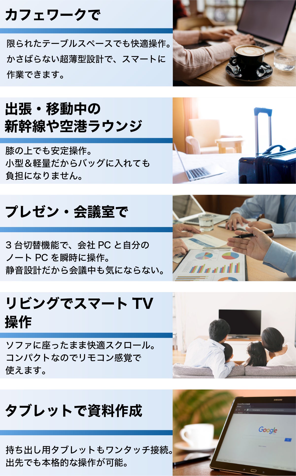 外出先や移動中でもスムーズに操作できる、ミニマウスならではの高い携帯性と機動力を実現しました。