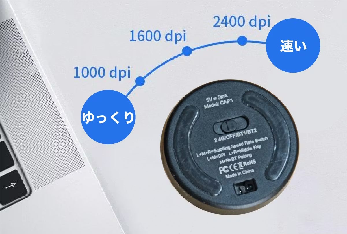 さらに、このミニマウスには用途に応じて切り替えられるDPI調整機能も搭載されています。1000 / 1600 / 2400 DPIの3段階から選択可能で、作業内容に合わせて最適な操作スピードに簡単に調整できます。例えば、資料作成や画像編集など精密さが求められる作業では低速モード、日常的な業務やブラウジングではバランスの良い中速モード、そして大画面での作業や素早い操作が必要な場面では高速モードといったように、シーンごとに最適な設定を選ぶことができます。この柔軟性により、どんな作業でも快適に対応でき、作業効率の向上にもつながります。