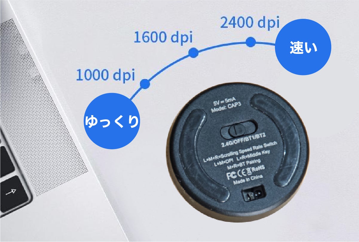 1000 / 1600 / 2400 DPIの3段階から選択でき、精密な操作が求められる場面でも快適にお使いいただけます。