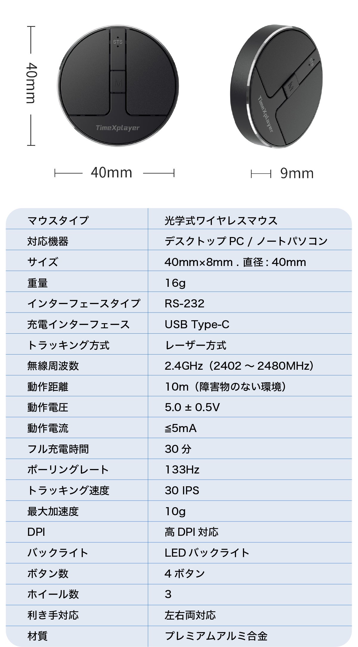 43mm × 36mm × 8mmのコンパクト設計、重さはわずか16g。