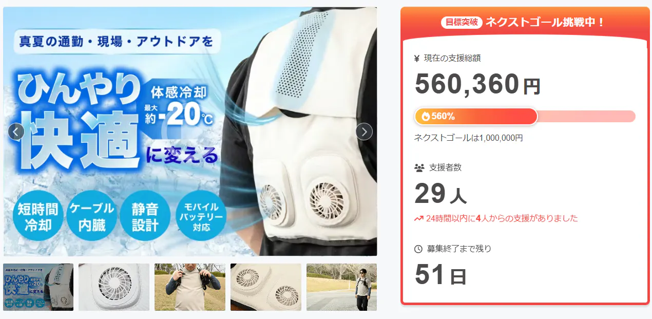 2026/03/29 12:00皆さんこんにちは、Brightチームです。この度は「着た瞬間ひんやり。半導体冷却×送風で、夏の作業・通勤をクールに【冷却ベスト】」を支援いただき、本当にありがとうございます。おかげさまで開始から50分で目標を達成することが出来ました。また本日のCampfireランキングプロダクト部門で12位に入賞することが出来ました!皆さまの支援を励みに、喜んでいただける製品作りに努めてまいります。05月23日まで販売期間は続きますので、ぜひSNSでのシェアや身近な方にもおすすめしていただけると嬉しく思います。https://camp-fire.jp/projects/923647/viewどうぞよろしくお願いいたします。ありがとうございました。スタッフ一同Brightチーム もっと見る
