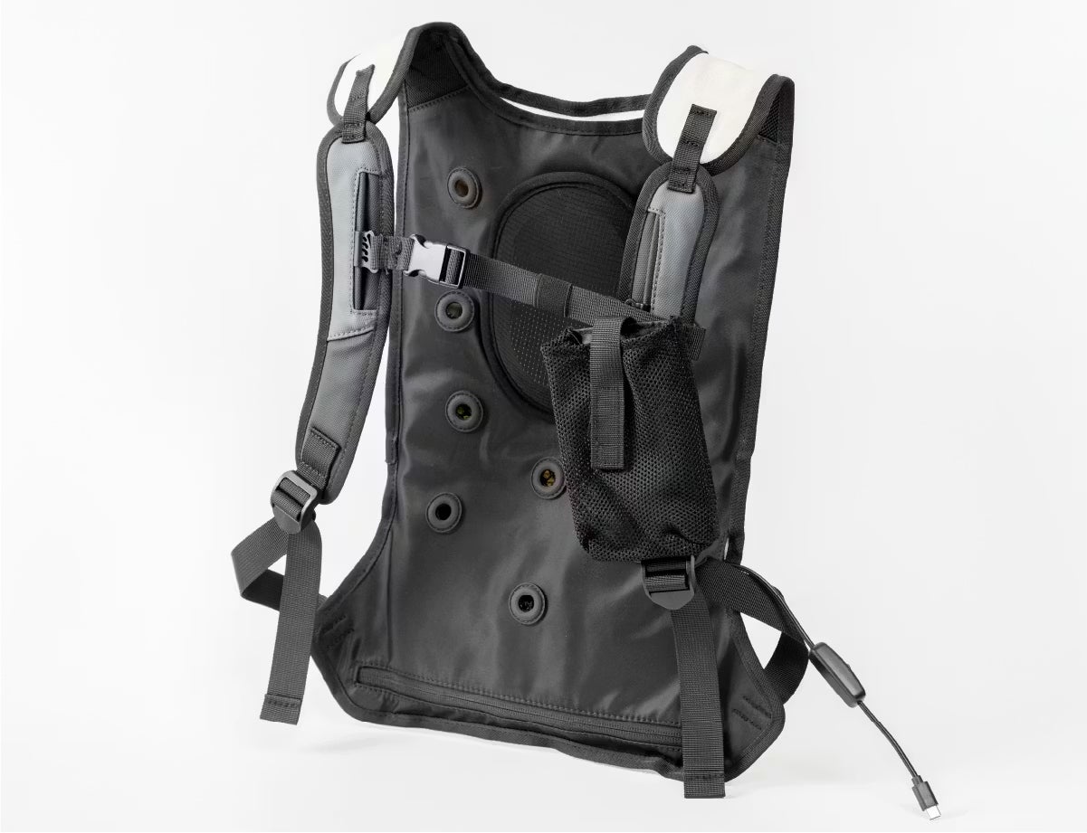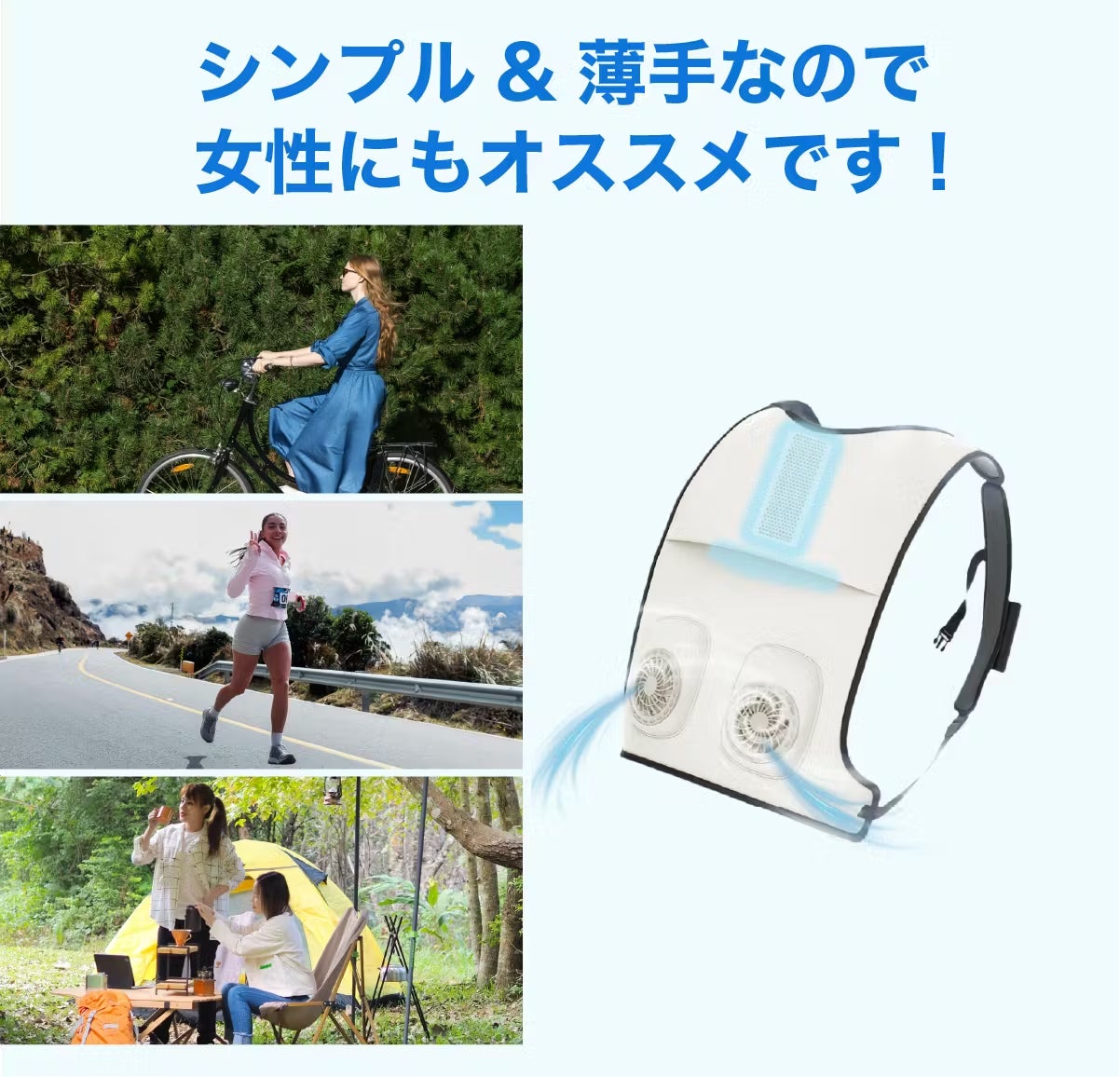従来の冷却システムは大きなファンが露出していましたが、本製品はシステムを内部に完備した薄手でシンプルなシルエットを実現しています。着ぶくれしにくいすっきりとしたデザインは、Tシャツやブラウスの上からでも自然になじみ、女性にとっても取り入れやすい一着です。驚くほどの軽量設計により長時間の着用でも負担にならず、通勤やアウトドアシーンにおいても高い耐久性と静かな冷却効果を両立させています。