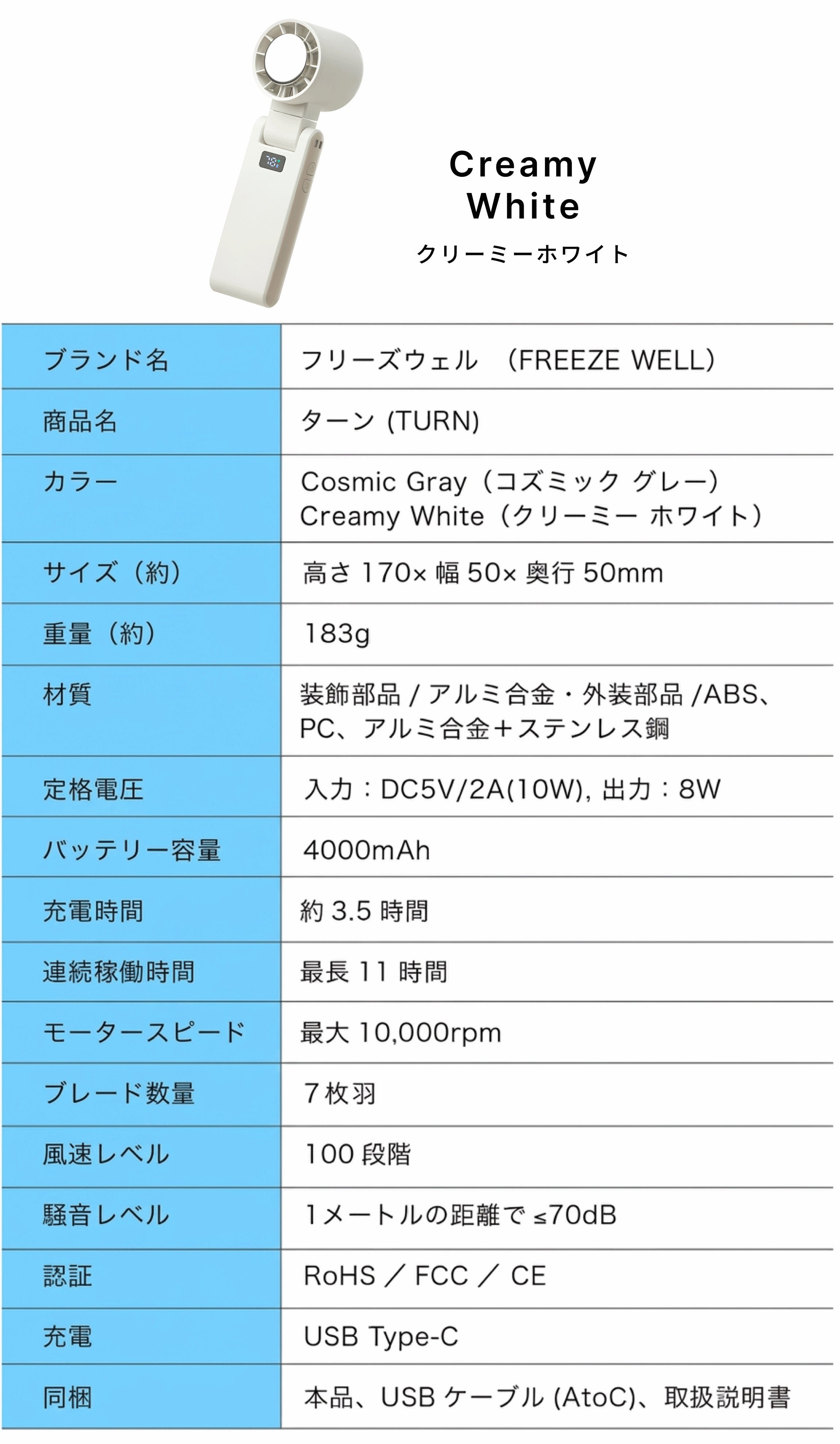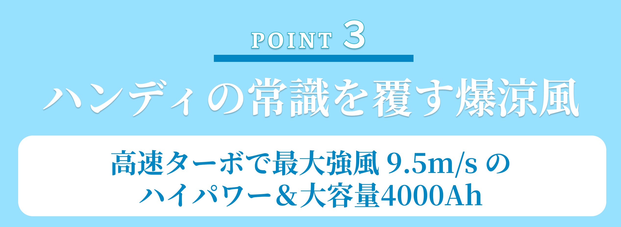 最大10,000rpmを誇る超高速ターボと独自の7枚羽が、コンパクトな見た目からは想像できない「最大風速9.5m/s」を実現。