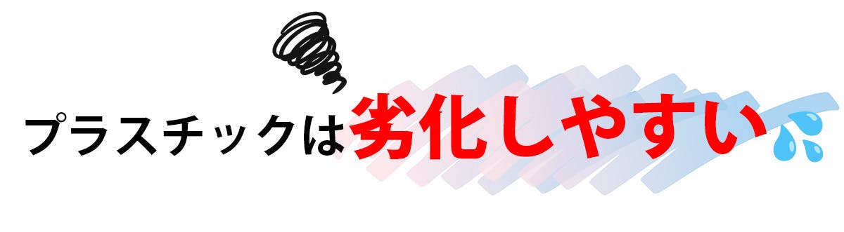 プラスチックは温度の影響を受けやすく、経年劣化や変形で脆くなることが多い素材です。また、物理的な衝撃に対しても弱く、落下や衝撃により亀裂や破損が発生することがあります。