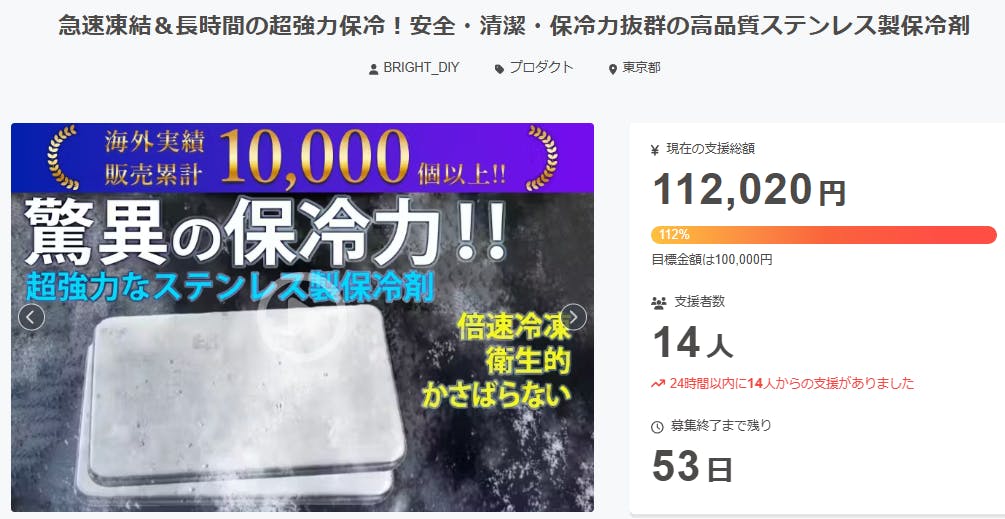 2026/03/08 12:56この度は「急速凍結&長時間の超強力保冷!安全・清潔・保冷力抜群の高品質ステンレス製保冷剤」に支援頂き誠にありがとうございます!お陰様で、開始から4時間経たずに10万円の目標金額を100%達成することができました。ご興味のある方、ぜひ支援お願い致します。https://camp-fire.jp/projects/923649/viewBrightチームは、当プロジェクトをもっと多くの方に知っていただきたいと考えております。よかったら、FacebookやTwitter等のSNSでのシェア・拡散をお願い致します。#brightdiyどうぞよろしくお願い致します。Brightチーム もっと見る