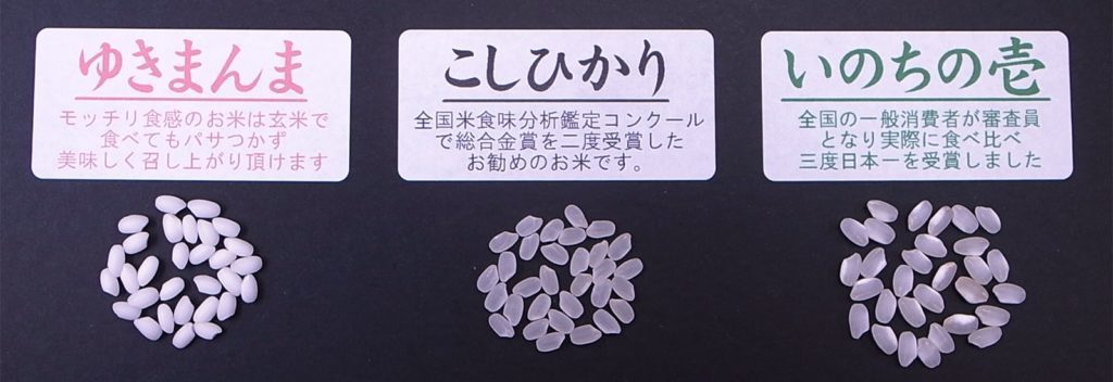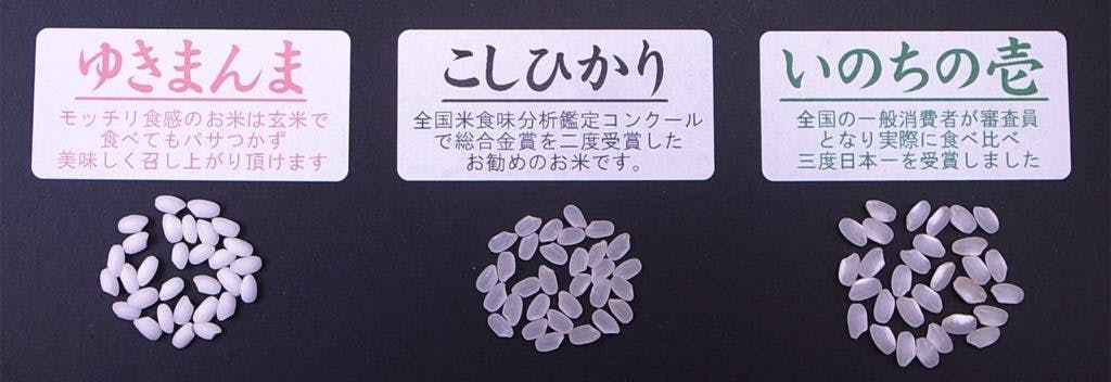 お米についてはいのちの壱、こしひかり、ゆきまんまと3種類のお米やお試しセット、
