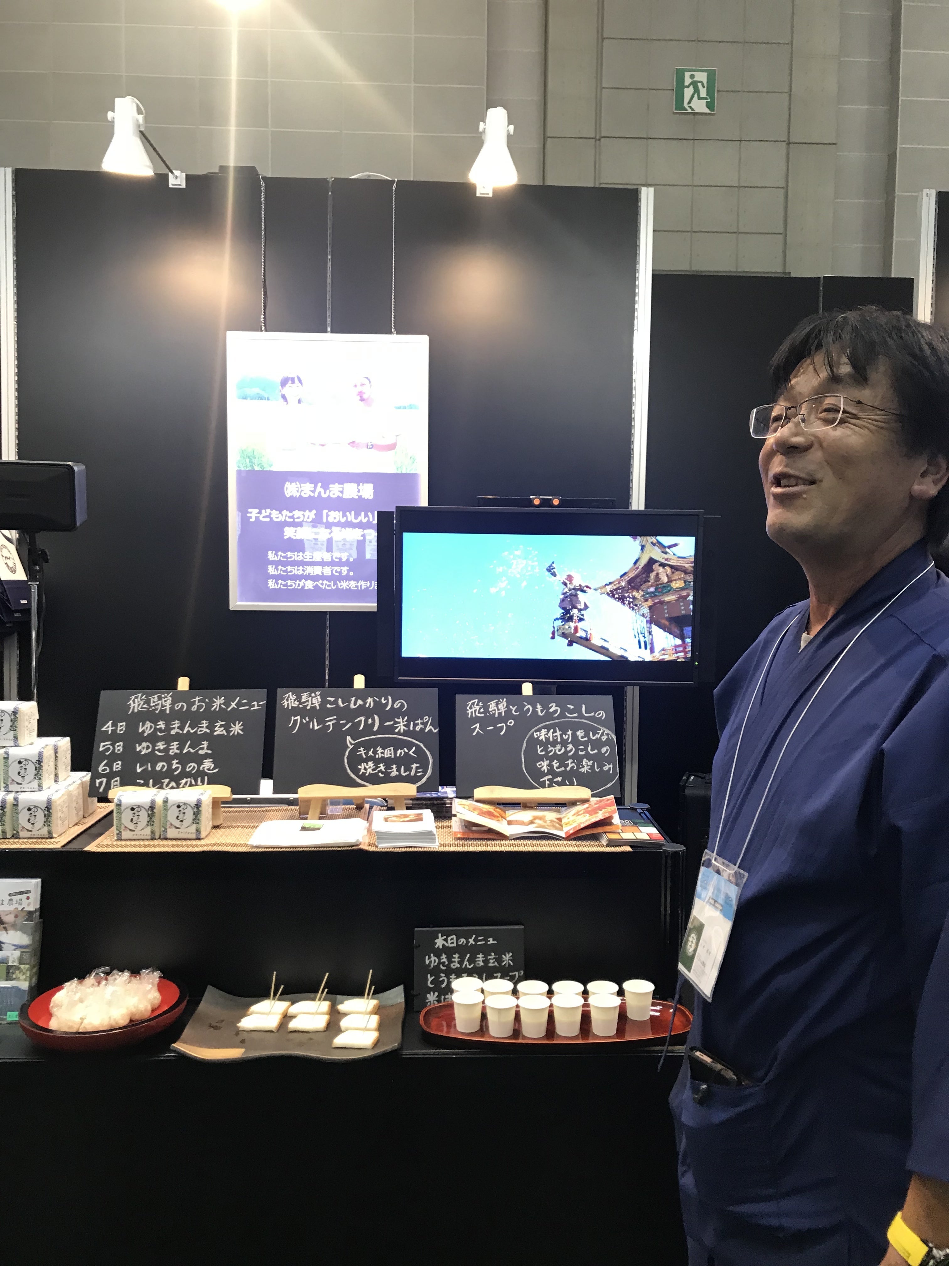 ブースでは、まんま農場のお米と飛騨トウモロコシの冷静スープ、米粉で作った米パンをご賞味いただけます。