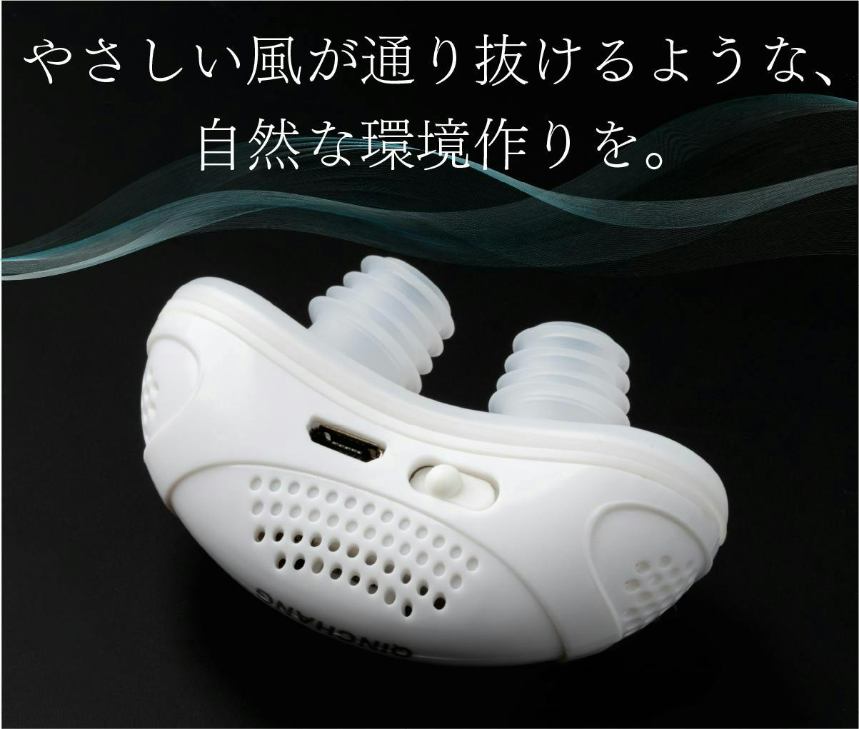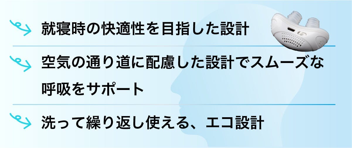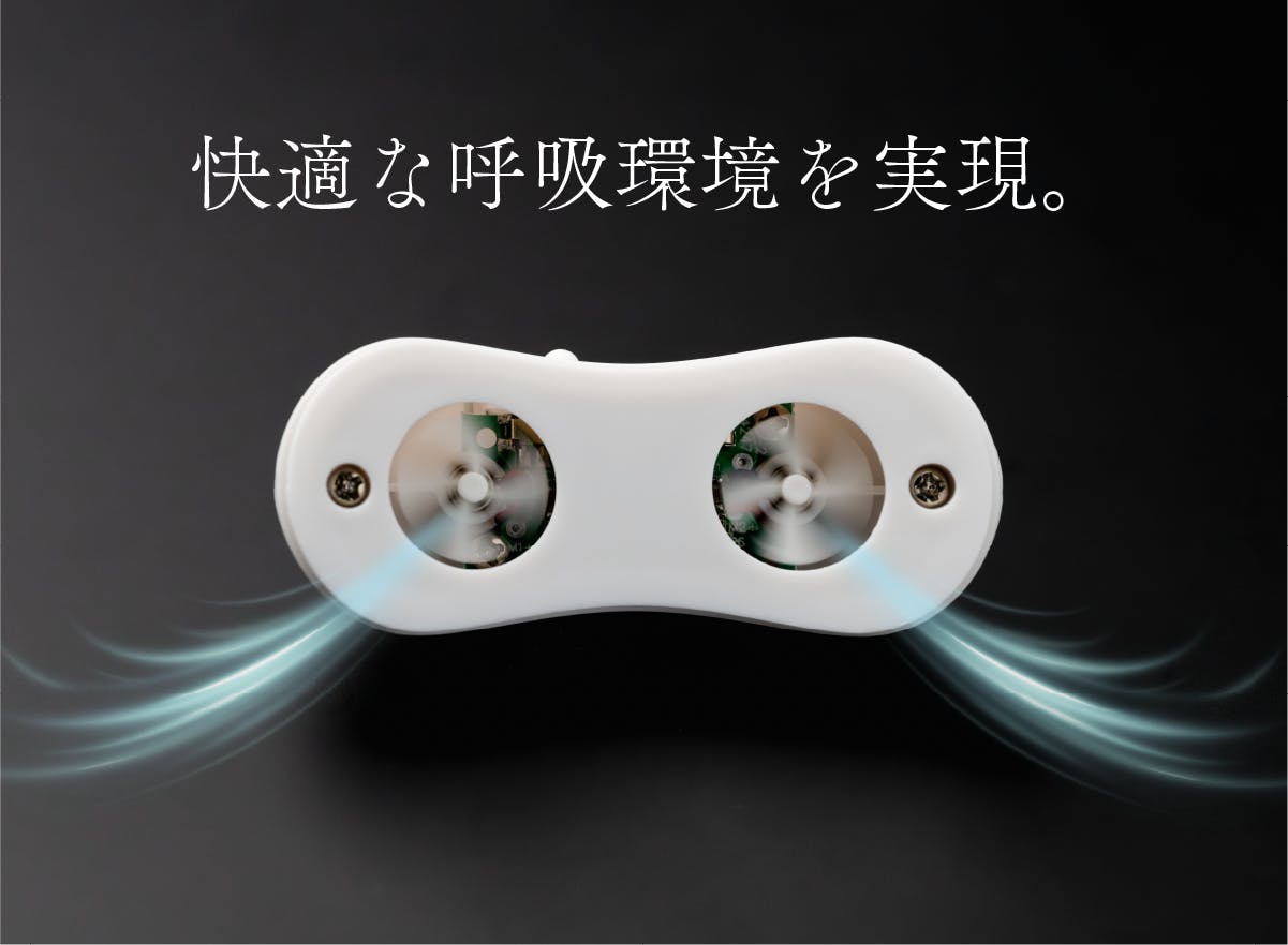 このデバイスは空気の流れに配慮した、いびきが気になる方の睡眠環境づくりをサポートするアイテムです。