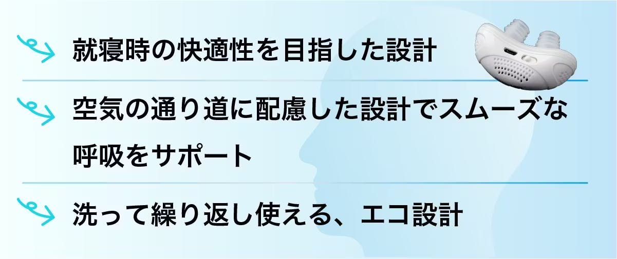 長時間使用できるバッテリー、手軽に充電できるUSB対応、そして優れた携帯性を兼ね備えたいびきデバイスは、自分の睡眠の質を大切にしながら、周囲への配慮も忘れたくない方におすすめです。自宅でも外出先でも場所を選ばず、快適で落ち着いた睡眠環境をやさしく支えてくれるアイテムです。家族や同室の方への気配りとしても役立ち、安心して眠れる空間づくりに貢献します。