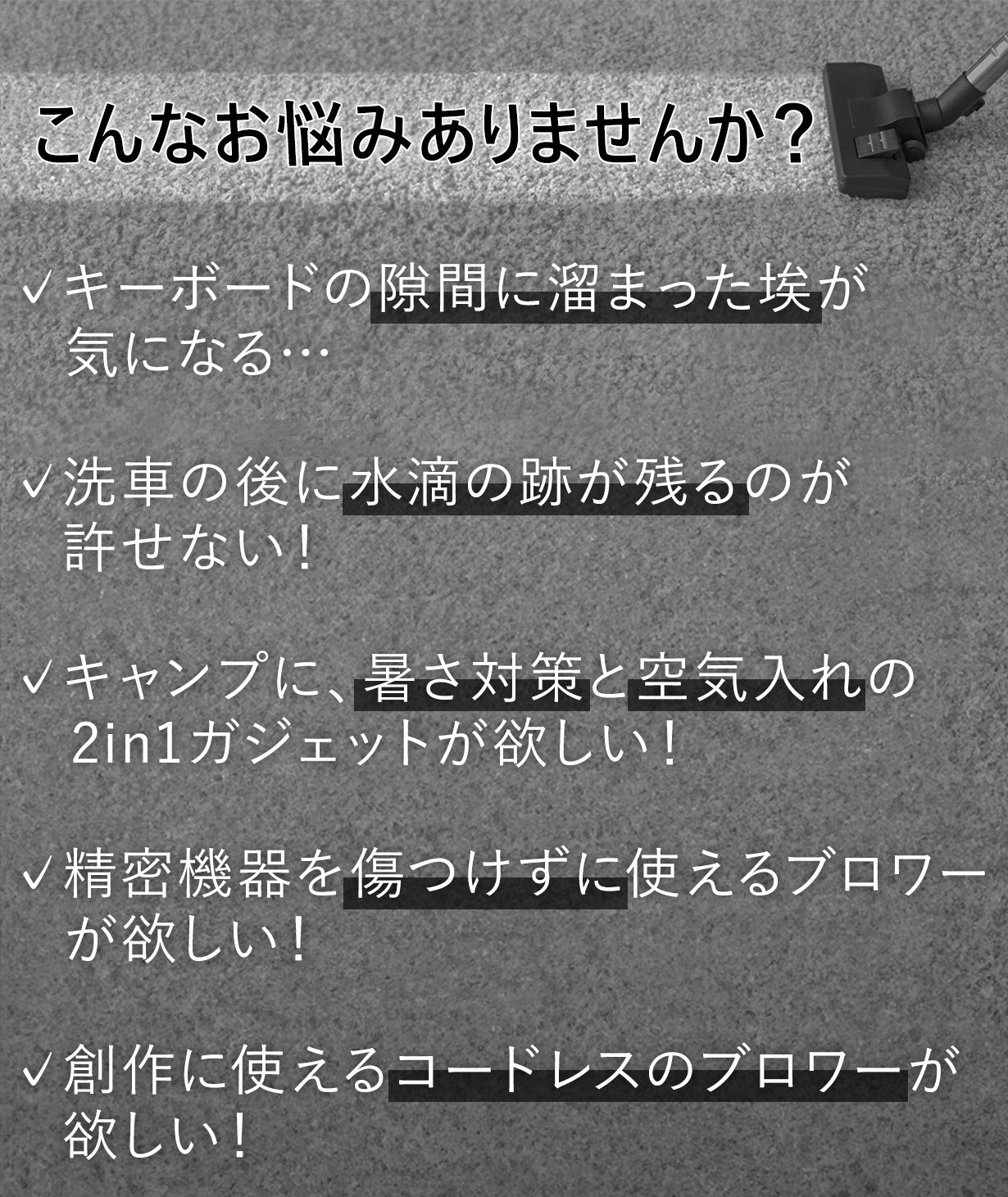 これひとつで空気入れ、ハンディ扇風機、車の掃除、洗車後の乾燥までできることを知り、まさに必要なものだと感動しました