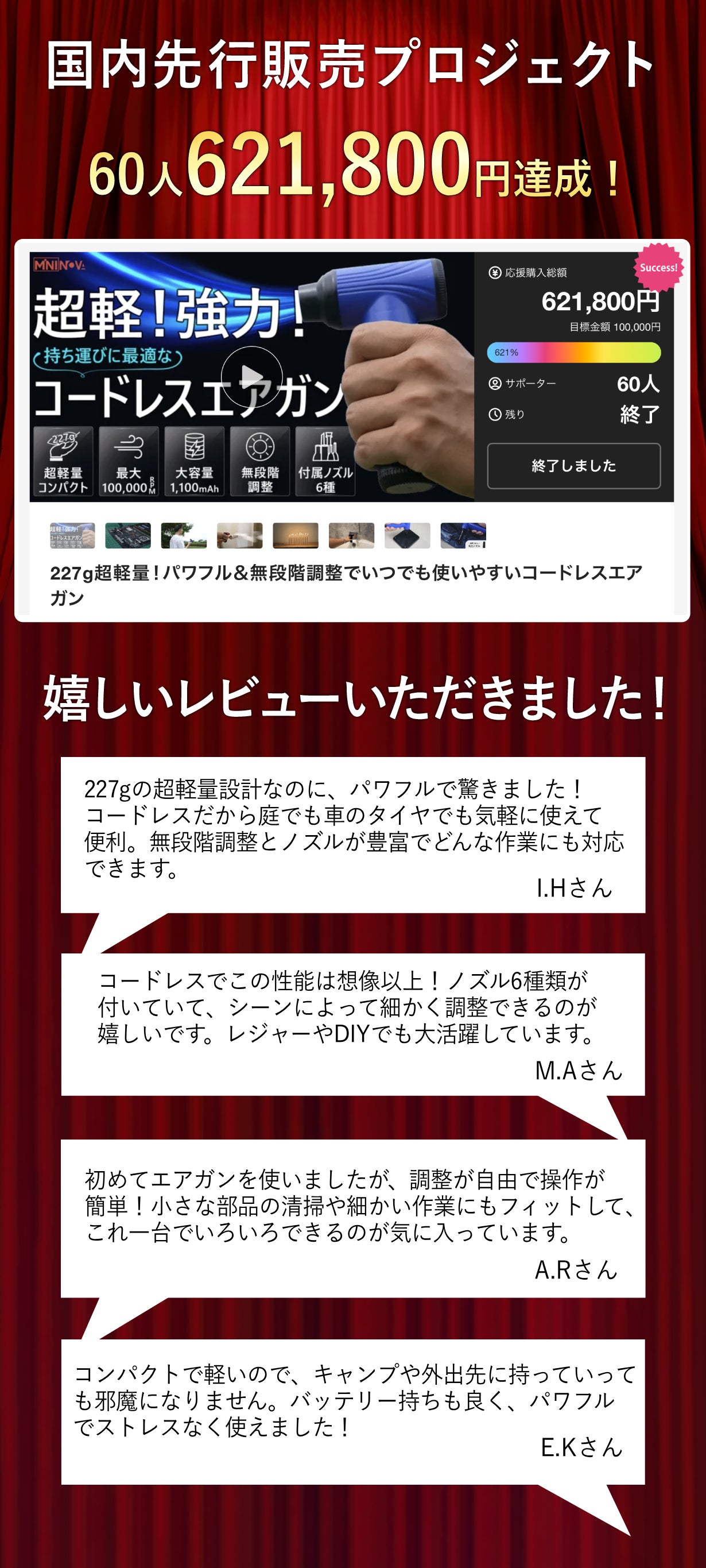 2026/04/08 21:00皆様、こんばんは!Bright DIYチームです。多機能で柔軟性があり、使いやすい清掃ツールを探しているなら、Mini Nova 1.0は間違いなく理想的な選択肢です。コンパクトながら強力なデザインのこの製品は、機能性と性能の完璧な組み合わせを提供し、精密な作業から強力な風が必要な作業まで、あらゆる清掃ニーズに対応します。1. 無段階で風速を調整できるツマミMini Nova 1.0の特徴的な機能の一つは、無段階で風速を調整できるツマミです。これにより、使用目的に応じて、風速をスムーズに調整できます。強力な風でホコリを吹き飛ばすことから、精密な機器を傷つけずに優しく清掃するための軽やかな風に切り替えることができます。強力な風: 広い面積やホコリが多い場所の迅速な清掃に最適です。例えば、パソコンのキーボードを清掃したり、工場や倉庫などの広いスペースでホコリを吹き飛ばす際に便利です。繊細な清掃: 精密な機器、カメラや壊れやすい電子機器を清掃する際には、ツマミで風速を下げるだけで、機器に優しく安全に清掃できます。2. 精密機器を優しくケアMini Nova 1.0は、強力な清掃ツールであるだけでなく、大切なアイテムのケアにも最適なパートナーです。カメラ、眼鏡、電子機器などの清掃に使用でき、傷をつけることなく繊細な部分を守ります。Mini Nova 1.0からの穏やかな風が、布やブラシを使わずに隙間や部品間のホコリを取り除き、表面を傷つける心配がありません。227gの超軽量設計を誇るMini Nova 1.0は、パワフルでありながら非常に扱いやすいアイテムです。Mini Nova 1.0は携帯性にも優れ、どこでも手軽に使用できます。自宅、オフィス、あるいは外出先でも、持ち運びが簡単で、すぐに清掃作業に取り掛かることができます。長時間の使用にも疲れにくく、ユーザーにとって非常に快適な使い心地を提供します。Mini Nova 1.0を使えば、強力かつ繊細な清掃ツールが手に入ります。多様なニーズに対応できるこの製品は、あなたのガジェットコレクションに欠かせないアイテムになること間違いなしです。今すぐMini Nova 1.0を試して、その便利さを実感してください!以上、Bright DIYチームでした!ご興味のある方はこの機会をお見逃しなく!https://camp-fire.jp/projects/view/923651Brightチームは当プロジェクトをより多くの方へ知って頂きたいと考えております。よかったら、SNSでのシェア・拡散をお願い致します。#mininova #brightdiyどうぞよろしくお願い致します。Brightチーム もっと見る