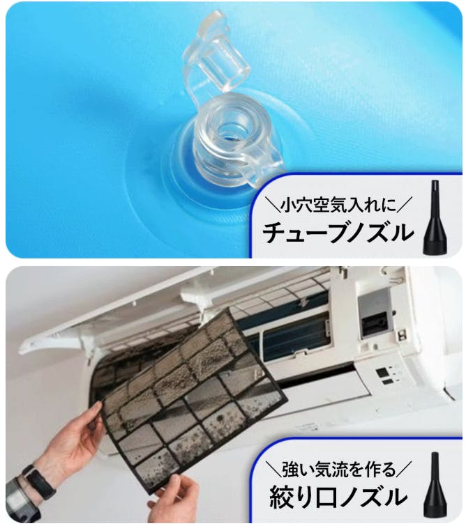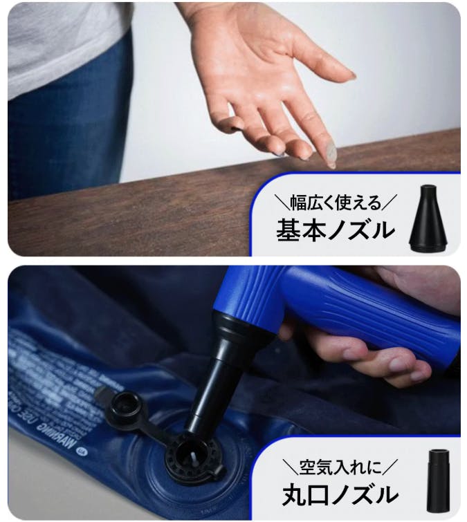 まず、丸口ノズルは風を広く分散させることができるため、広い面積の乾燥や軽いゴミを吹き飛ばす作業に適しています。洗車後の車体の水滴を飛ばしたり、家具やデスクの上に溜まったほこりを素早く取り除く際に便利です。また、基本ノズルはスタンダードな形状で風を均等に広げることができるため、日常的な掃除や軽い作業に使いやすい汎用タイプのノズルです。