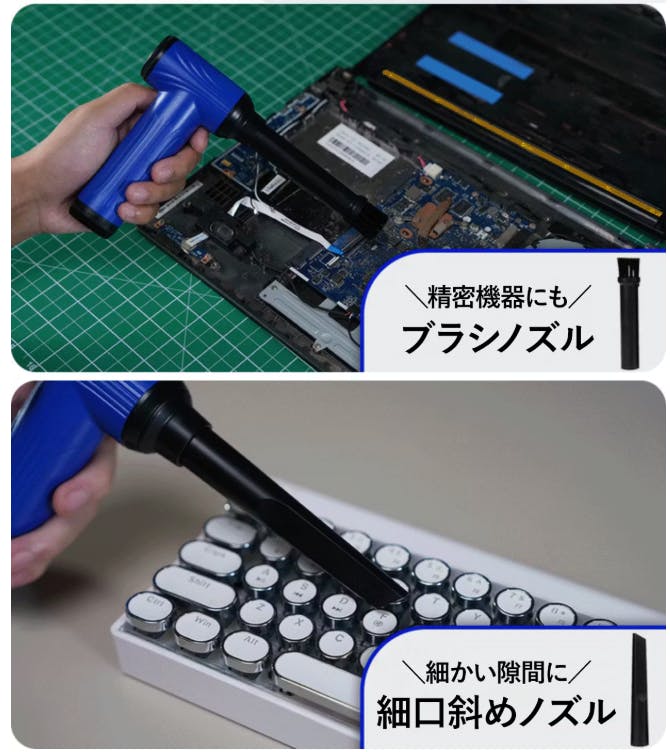 次に、細かな場所の掃除に役立つのがチューブノズルと細口斜めノズルです。チューブノズルは細い形状で、キーボードや家電の隙間などに入り込んだほこりをピンポイントで吹き飛ばすことができます。一方、細口斜めノズルは斜め方向に風を送り込むことができるため、家具の隙間や手の届きにくい場所の掃除に便利です。細かな部分までしっかりと清掃できるのが特徴です。