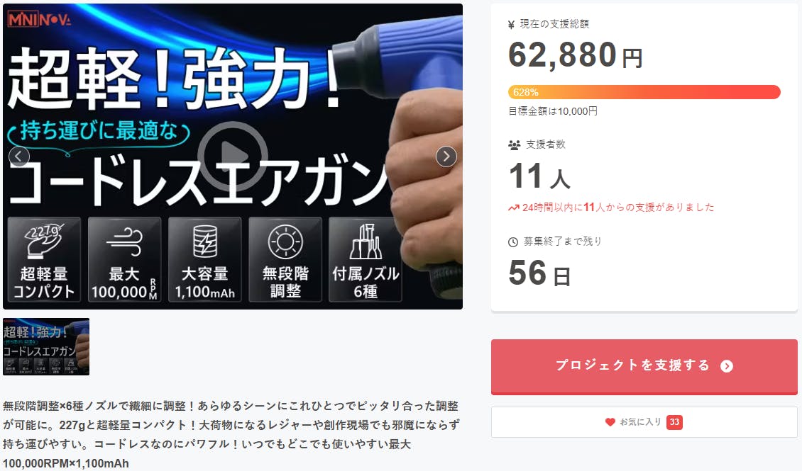2026/03/05 21:11この度は「227g超軽量!パワフル&無段階調整でいつでも使いやすいコードレスエアガン」に支援頂き誠にありがとうございます!お陰様で、開始から55分経たずに1万円の目標金額を100%達成することができました。ご興味のある方、ぜひ支援お願い致します。https://camp-fire.jp/projects/923651/viewBrightチームは、当プロジェクトをもっと多くの方に知っていただきたいと考えております。よかったら、FacebookやTwitter等のSNSでのシェア・拡散をお願い致します。#mininova #brightdiyどうぞよろしくお願い致します。Brightチーム もっと見る