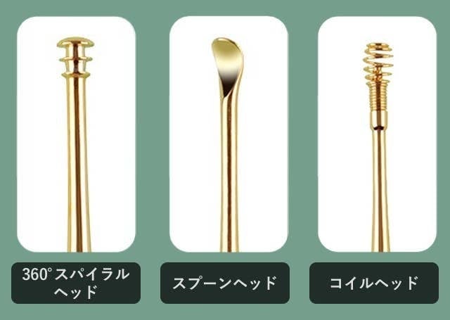 コイルヘッドは、らせん状の丸い先端で設計されており、360° 回転して耳垢を除去します。360°スパイラルヘッドは三層構造により取りにくい耳垢もごっそり除去スプーンヘッドは15° カーブスプーン自然なカーブと膨らみで狙ったところをピンポイントキャッチ。さらに、錆びにくいステンレス素材のため、水洗いもOK!体に直接触れるものだからこそ衛生的に使いたい。