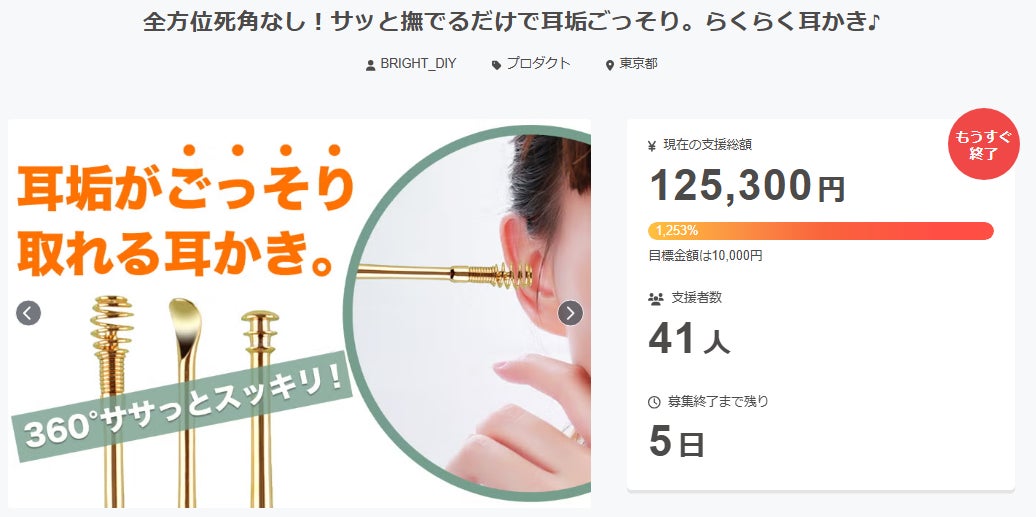 2026/04/25 12:00ご支援者 様、全方位死角なし!サッと撫でるだけで耳垢ごっそり。らくらく耳かき♪にご興味をお持ちいただきありがとうございます。お陰様で、開始から支援総額12万円達成することができました!終了までわずか 5 日となります。プロジェクト終了後、「全方位死角なし!サッと撫でるだけで耳垢ごっそり。らくらく耳かき♪」をCamfire特別価格で入手することはできなくなりますので、ご支援がまだの方、追加支援 をご検討の方はお急ぎくださいますようお願い申し上げます。ご興味のある方はこの機会をお見逃しなく!https://camp-fire.jp/projects/view/923652Brightチームは、当プロジェクトをもっと多くの方に知っていただきたいと考えております。よかったら、FacebookやTwitter等のSNSでのシェア・拡散をお願い致します。#brightdiyどうぞよろしくお願い致します。Brightチーム もっと見る