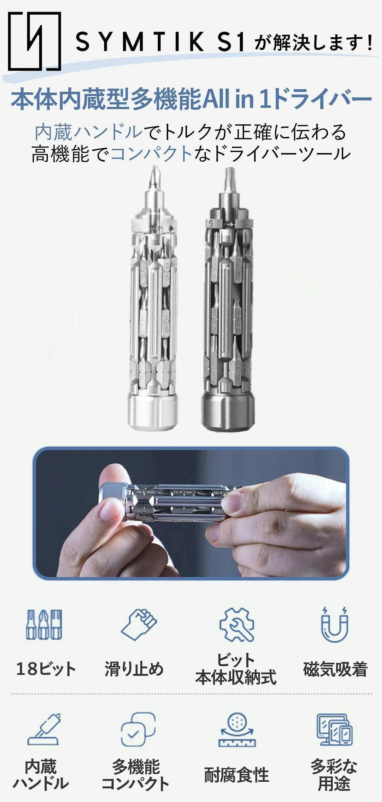 SYMTIK S1は、その多機能でコンパクトな設計が魅力のドライバーツールです。細いドライバーではトルクがかけにくい、金属製のドライバーは滑りやすいといったお悩みに、このツールが一石二鳥で応えてくれます。