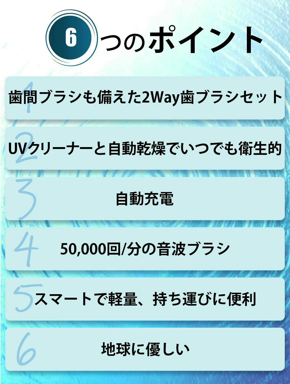 50,000回/分の音波振動で外出先でも口内をスッキリ清潔に!自動乾燥&UVクリーナー付きの歯ブラシ&歯間ブラシセットは、ケースに収納するだけで衛生的に保たれ、自動充電機能も搭載して便利です。いつでも清潔で爽やかな息を保ちます!