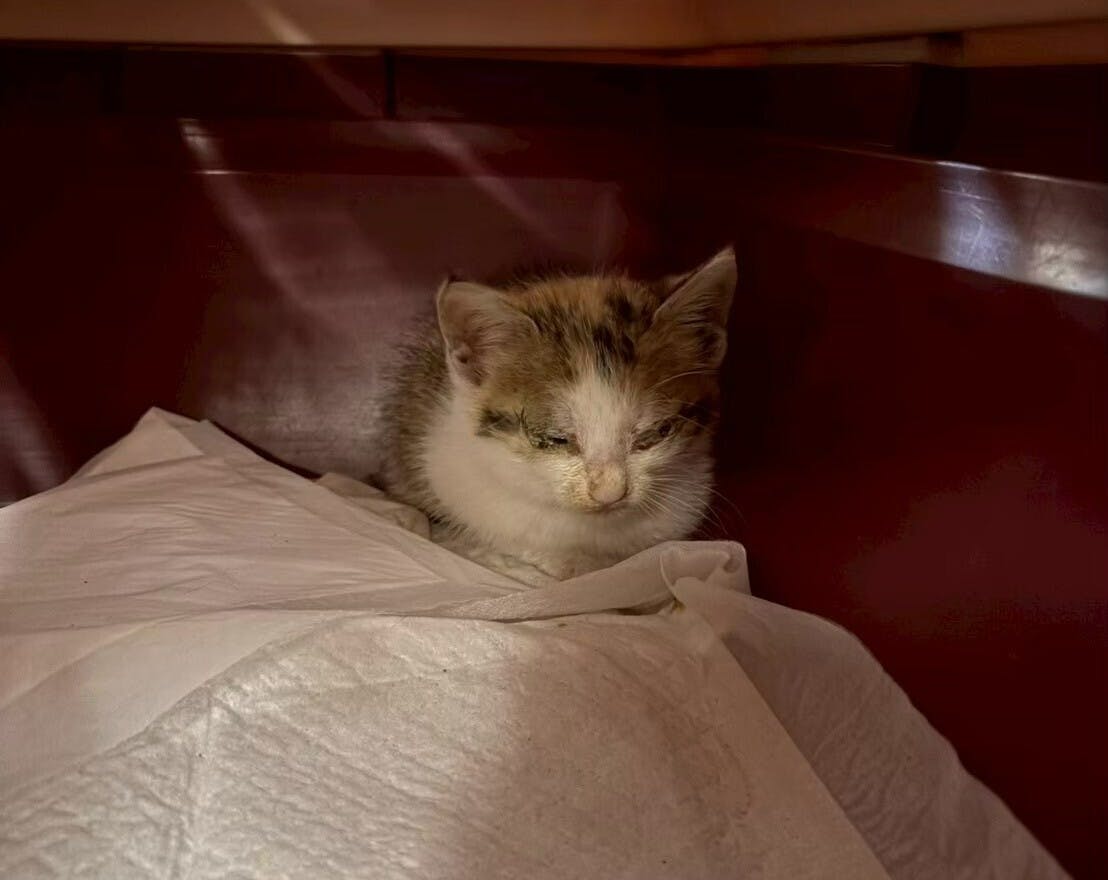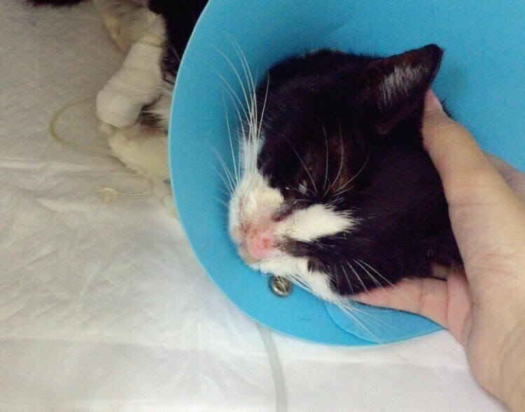 ゴマはガリガリに痩せ、目と鼻は膿汁だらけで異臭がして、今にも死んでしまいそうな猫でした。私はいてもたってもいられず着ていたカーディガンで彼を包み、近くの動物病院へ駆け込みました。