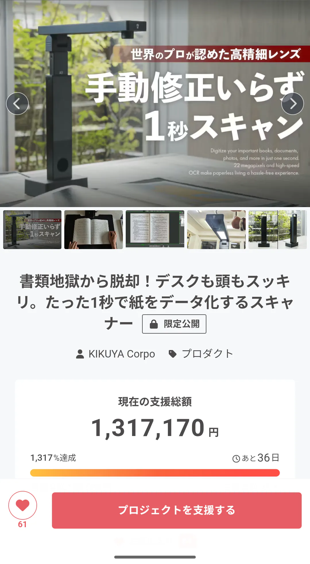 昨日公開いたしました「たった1秒で紙をデータ化するスキャナー(Eloam-BS2200M)」のプロジェクトですが、なんと開始わずか1日で、目標の1300%(支援総額130万円)を突破いたしました。