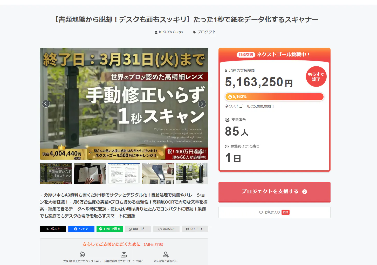 2026/03/29 11:40いつも応援ありがとうございます。この度、ネクストゴール500万円を達成することができました現在、・支援総額:5,041,270円・支援者数:83名ここまで来ることができたのは間違いなく、応援してくださった皆さまのおかげです。本当に、本当にありがとうございます。そして今、強く感じていることがあります。83人もの方の「部屋」や「日常」が変わるこのスキャナーを通して・紙の整理が進む・本を裁断せずに残せる・デスクや頭の中がスッキリするそんな変化が、83人の方に届くと思うと本当に感慨深い気持ちです。そして、このプロジェクトはまだ終わりではありません。残り2日、さらに多くの方に届けたいと思っていますもし少しでも「いいな」と思っていただけましたらこの機会にご覧いただけたら嬉しいです▼プロジェクトはこちらhttps://camp-fire.jp/projects/923720/view�残り2日。最後まで全力で走ります。引き続き、どうぞよろしくお願いいたします。 もっと見る