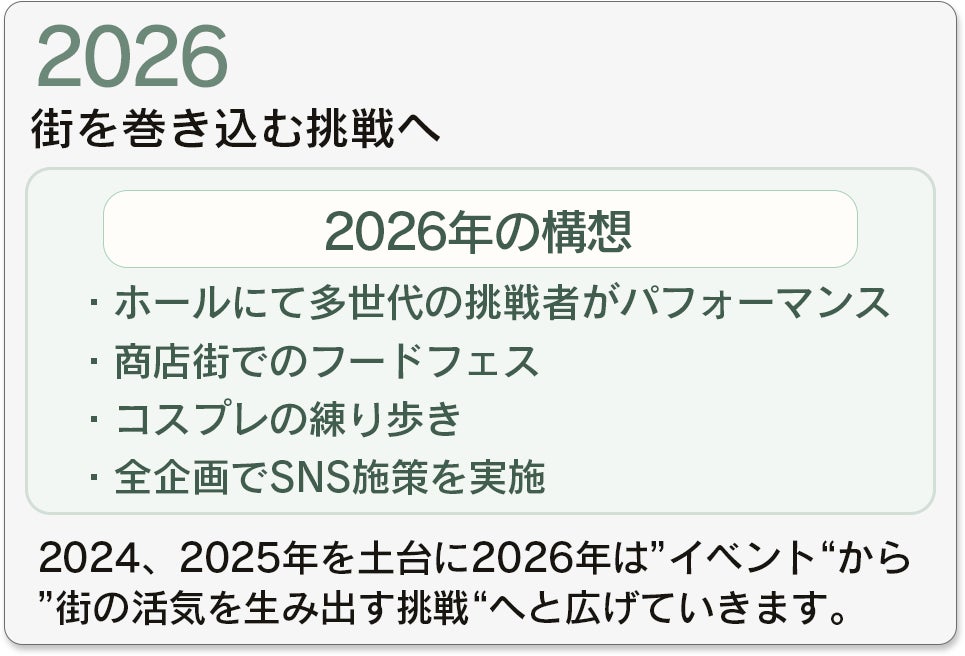 参加者がSNS投稿したくなるように商店街にて多くのコスプレイヤーが練り歩きを行うことで商店街を“買い物の場”から“体験の舞台”へと進化させます。