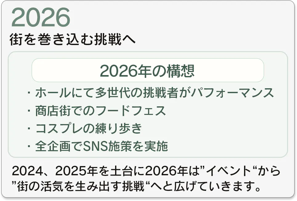 参加者がSNS投稿したくなるように商店街にて多くのコスプレイヤーが練り歩きを行うことで商店街を“買い物の場”から“体験の舞台”へと進化させます。