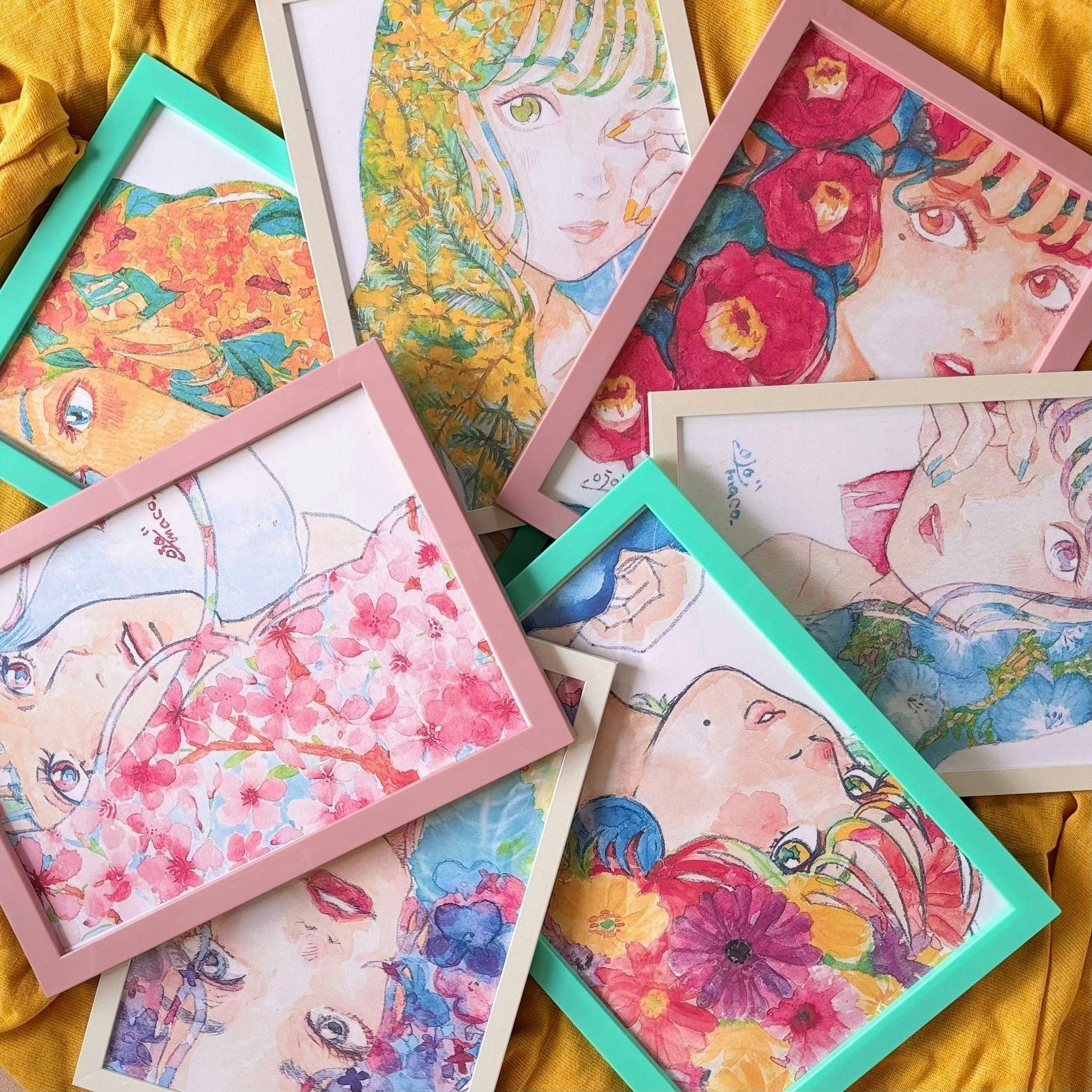 これまで、透明水彩を中心に人物や花の作品を描き、原画制作やポストカードなどの形で発表してきました。