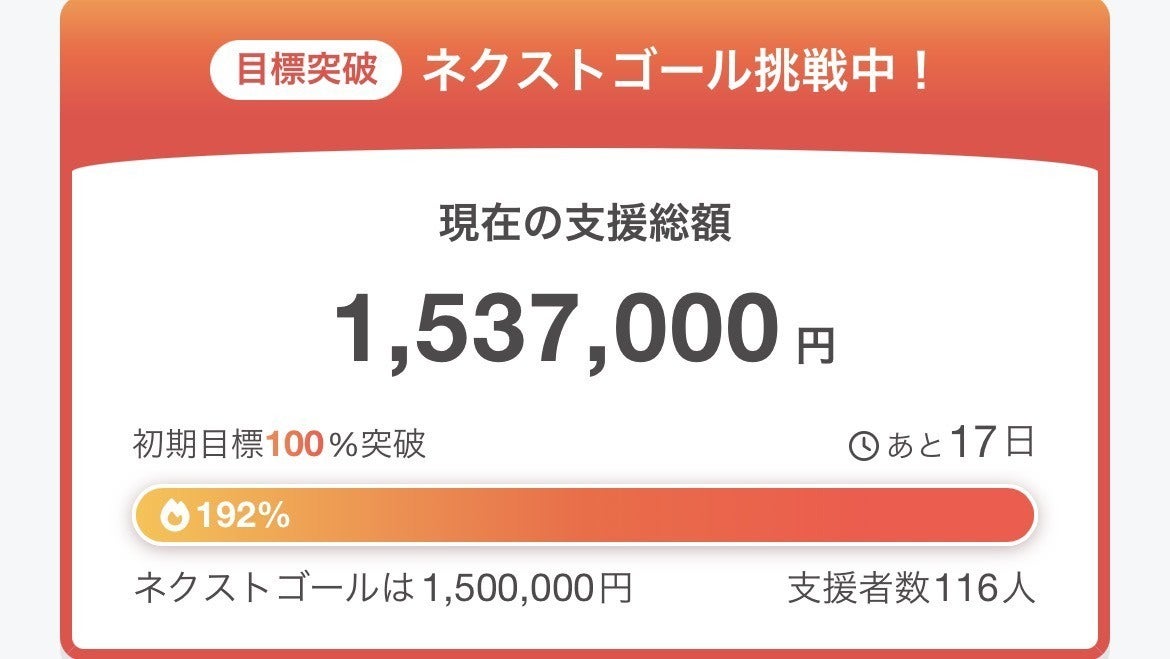 2026/03/21 18:513/18 第三目標を突破することができました!!20日経たずでの突破で、驚きと感謝で必死に脳が処理している。というのが率直な感想です。本当にたくさんの方から毎日連絡やご支援をいただいております。支援者数も100名を突破し、個人的に連絡をいただいた方々を合わせるとそれ以上の数になります。本当にたくさんの方達に愛をいただいているんだなとつくづく感じます。愛の数じゃなくて強さだとも思っていますが、やっぱりたくさんいただくのもうれしいです。ていうか、「多くて強い」なので最強かもですね。残りの期間も走り抜けます!!どうぞよろしくお願いいたします!! もっと見る