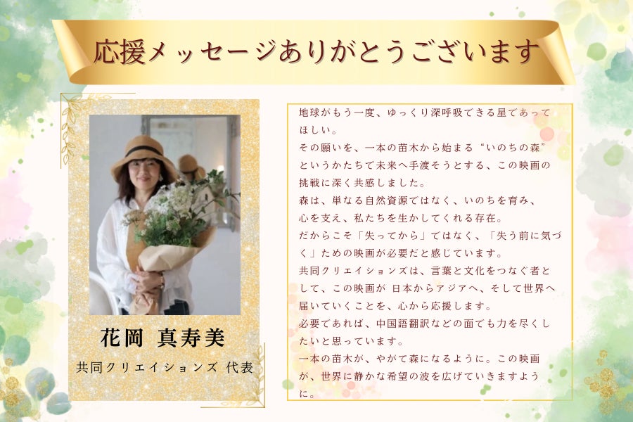 共同クリエイションズ代表 花岡真寿美さんより、応援メッセージをいただきました。花岡さんは、言葉や文化をつなぐ活動を通して、日本とアジア、そして世界を結ぶ共創の場を生み出してこられた方です。 この映画の想いに共鳴してくださり、あたたかいメッセージをお寄せくださいました。花岡さん、心のこもった応援メッセージを本当にありがとうございます!こうして、この映画の想いに共鳴し、応援してくださる方々が少しずつ広がっていることを、とても心強く感じています。一本の苗木が森へと育っていくように、この映画もまた、たくさんの方の想いに支えられながら未来へ広がっていくことを願っています。***クラファン終了まで残り9日!!残り日数が一桁となりました。本日は春分の日。春分の日は「自然をたたえ、生物をいつくしむ」ことを目的とした日です。この映画の想いと共鳴するような意味を持ち、だんだんと日が長くなっていくこの日から、またさらに、映画完成に向けて希望を持って歩んでいきます。 どうぞ応援よろしくお願いいたします。大切なつながりのある周りの方々にも、ぜひご紹介いただけるとありがたく思います!