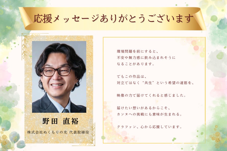株式会社ぬくもりの光 代表取締役 野田直裕さんより、応援メッセージをいただきました。野田さんは、愛知県半田市を中心に、精神障がいのある方々が安心して暮らし、自立へと向かっていけるグループホームの運営をされています。 また、使われなくなった戸建て住宅を“ぬくもりのある空間”へとリフォームし、空き家の活用と福祉を結びつける取り組みを続けてこられました。現在は、メンタルクリニックを中心に複数の福祉施設が集まる「北欧型福祉ビレッジ」の構想のもと、地域の中で支え合う新しい福祉の形づくりにも取り組まれています。野田さんご自身もクラウドファンディングを投稿されているご経験があり、とても心強い応援です。そんな野田さんが、この映画の想いに共感し、応援のメッセージを寄せてくださいました。野田さん、あたたかい応援のお言葉を本当にありがとうございます。こうして、この映画の想いに共鳴し、応援してくださる方々が少しずつ広がっていることを、とても心強く感じています。***残り8日!私たち映画製作委員会も、みなさんの応援に背中を押してもらいながら、精一杯、でもワクワクしながら進んでまいります!引き続き、どうぞよろしくお願いいたします。