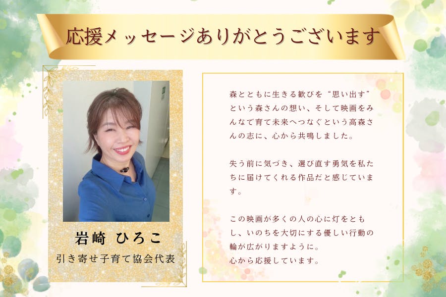 2026/03/13 14:53活動報告をご覧いただき、ありがとうございます。このたび、私たちが心から尊敬している 引き寄せ子育て協会代表・岩崎ひろこ様より、心温まる応援メッセージをいただきました。ひろこ様は、「お母さん自身が自分の人生を愛し、輝くことで、子どもも自然と伸びていく」という想いのもと、これまで多くの親子に寄り添い続けてこられました。ひろこ様とお話していると、悩んでいた人もいつのまにか「私も大丈夫かもしれない」と、未来を信じられるようになる。そんな温かい力を持った方です。 「誰かの幸せを心から願う」そんな活動を続けている方にこの映画を応援していただけることは、私たちにとって何よりの励みであり、大きな力となっています。ひろこ様、本当にありがとうございました。~皆さまへのお願い~ プロジェクト終了まで、残りわずかとなりました。この映画を通して、「愛の循環」をさらに広げていきたいと思っています。もしよろしければSNSでのシェアや、最後のひと押しのご支援で私たちの挑戦を応援していただけましたら嬉しいです。どうぞよろしくお願いいたします。 もっと見る
